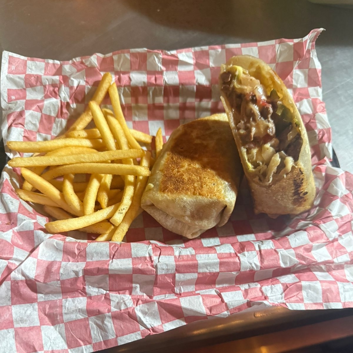 120 grs. Arrachera, cebolla, Jitomate, Morron, Champiñon, Queso Gouda, lechuga, acompañado de Papas Fritas