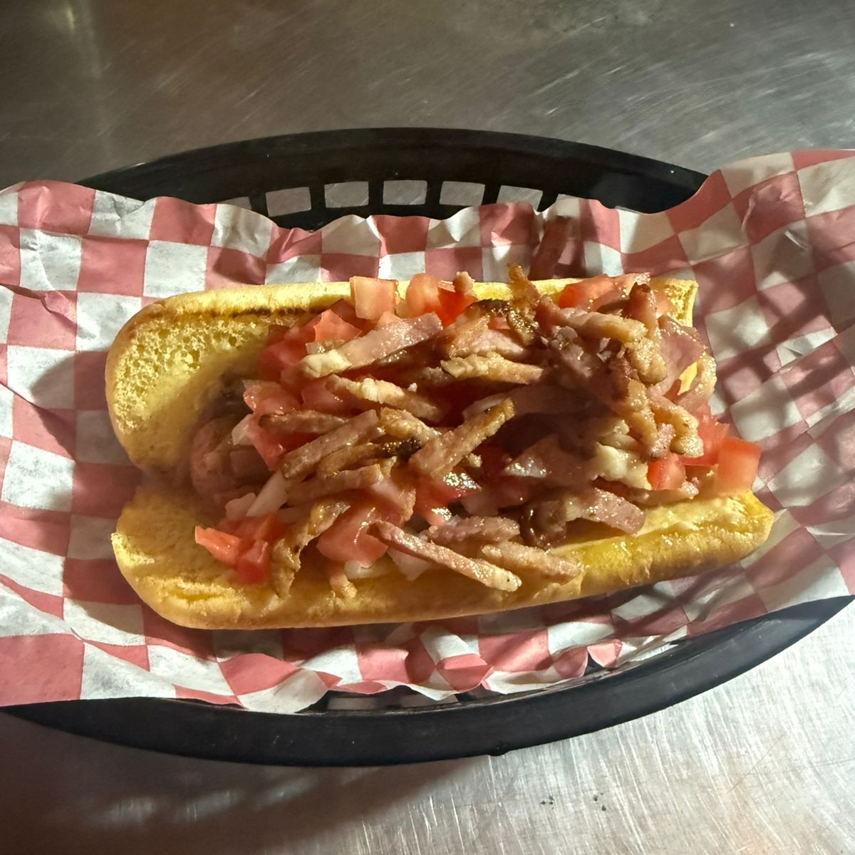 Salchicha, tocino, Cebolla guisada, Queso Gouda y Papas Fritas
