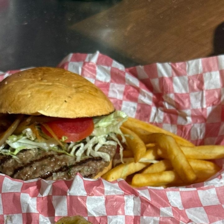 150 grs de Carne Hecha en Casa, Queso Gouda, Tocino, Lechuga, Jitomate, Cebolla Morada Asada y Papas Fritas