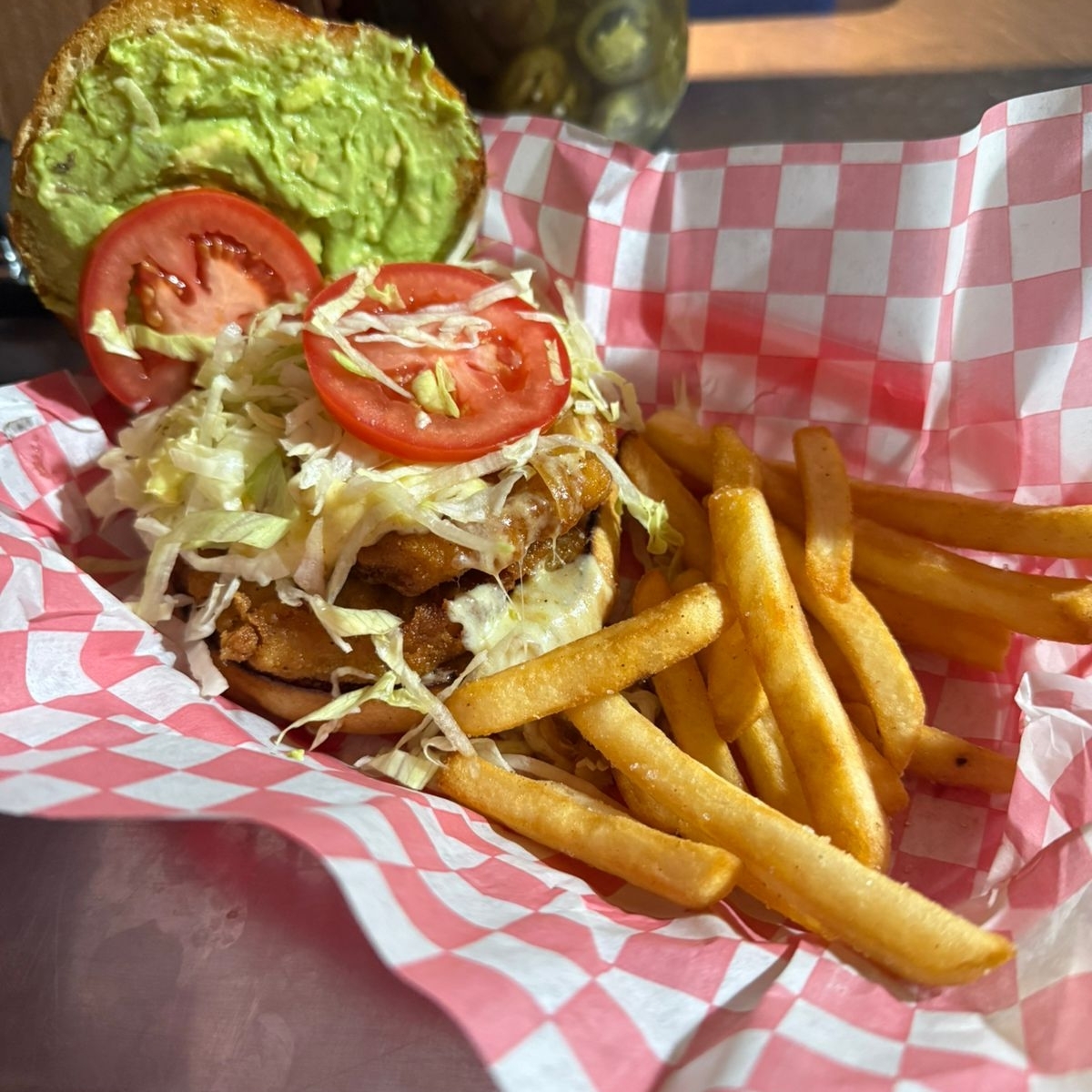 150 grs. de milanesa de Pollo Empanizada, Queso Gouda, Cebolla guisada, Lechuga, Rico Guacamole y Papas Fritas