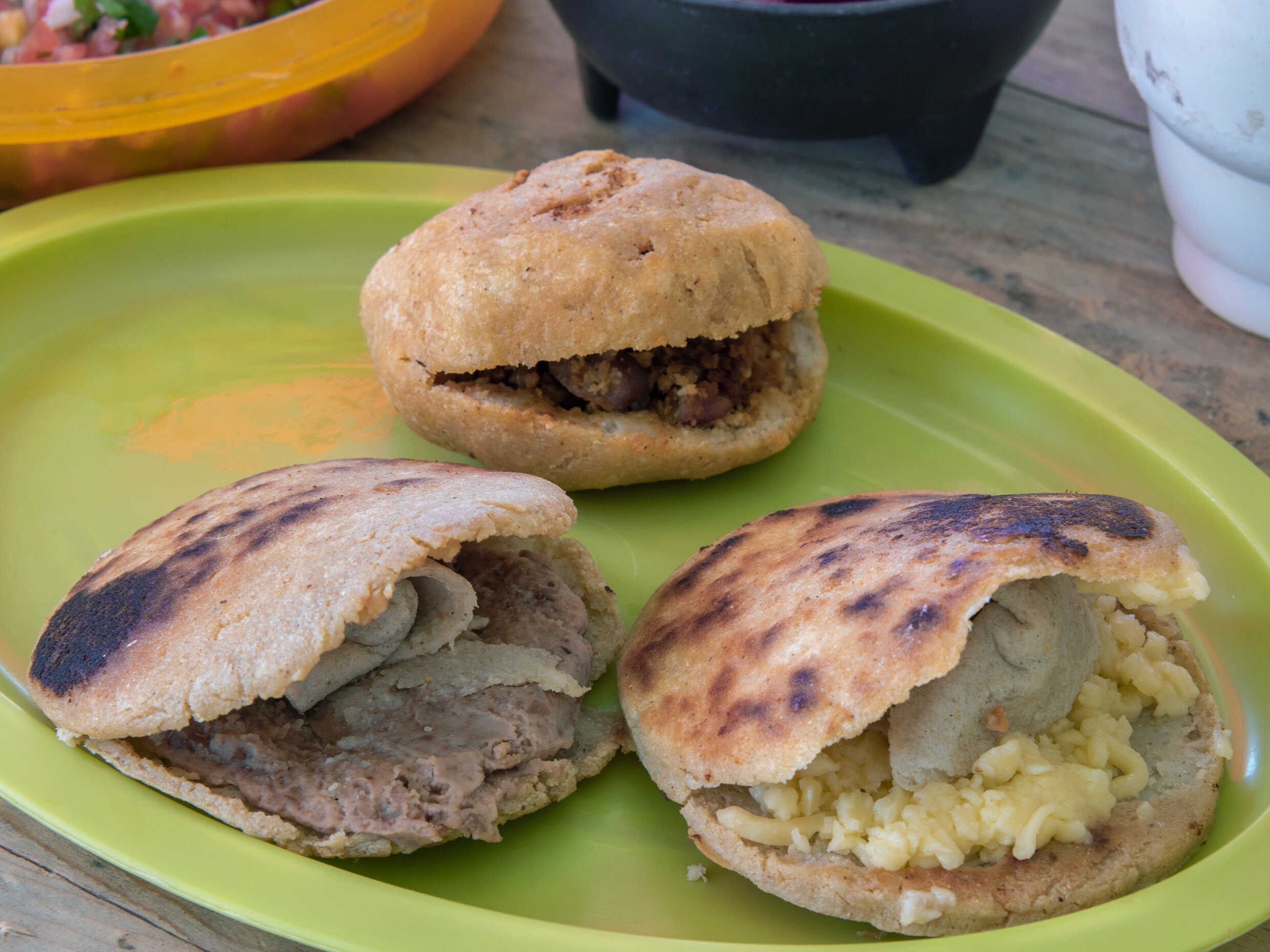 Tortilla con queso, salsa de aguacate, salsa roja y salsa mexicana.