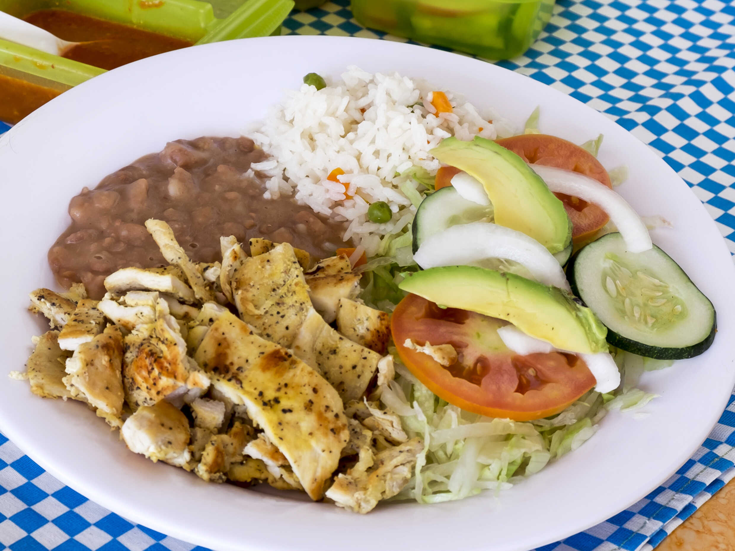 Deliciosa Pollo a la Plancha acompañado de 3 guarniciones que son frijoles, arroz y ensalada acompañada de un Agua Fresca de 500ml. Incluye salsas y tortillas recién hechas.