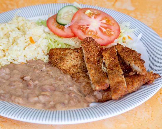 Deliciosa milanesa de pollo empanizada acompañada e 3 guarniciones que son frijoles, arroz y ensalada acompañada de un Agua Fresca de 500ml. Incluye salsas y tortillas recién hechas.