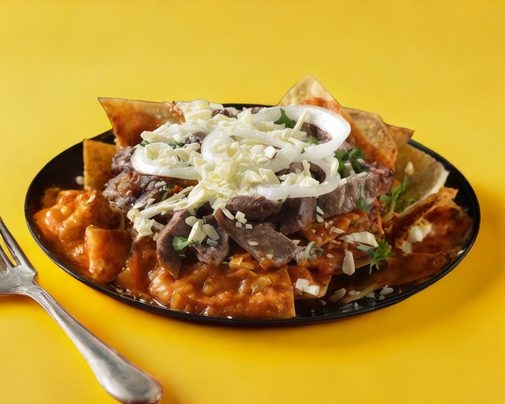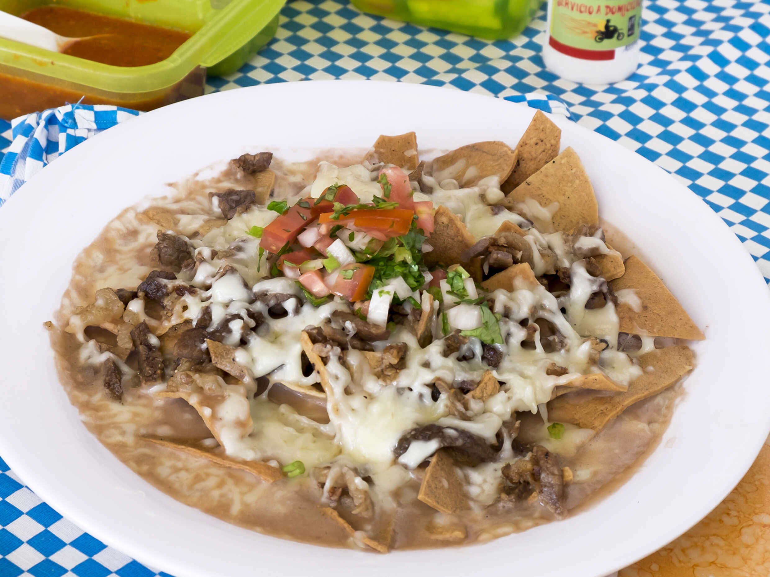 Totopos con carne asada, queso y salsa.
