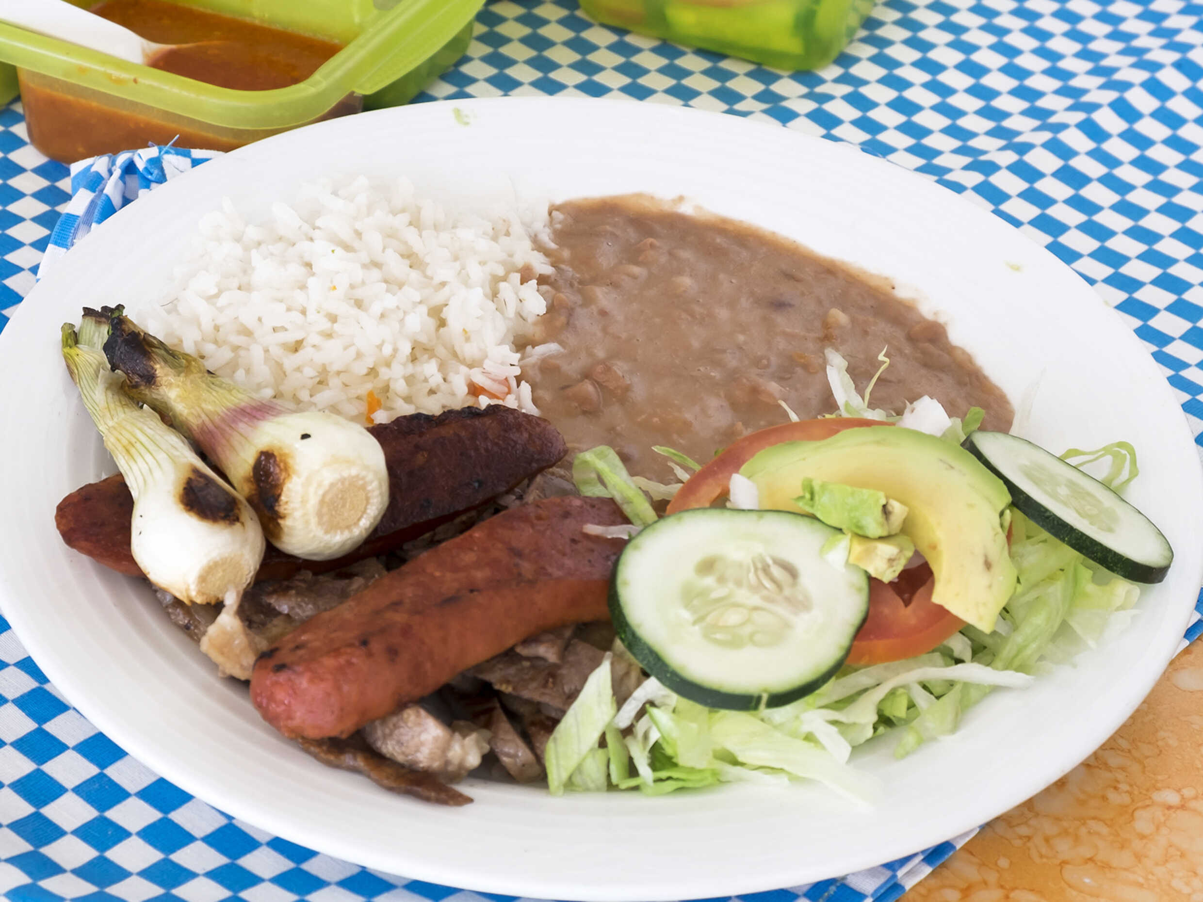 Deliciosa Carne Asada con chorizo, cebollita cambray y salsa me 3 guarniciones que son frijoles, arroz y acompañada de un Agua Fresca de 500ml. Incluye salsas y tortillas reciénen hechas