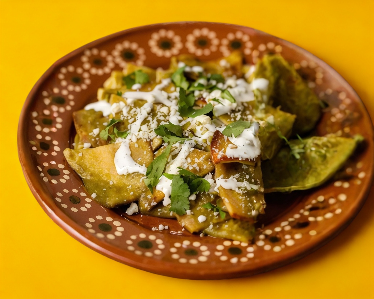 Totopos bañados en salsa verde con crema y queso.