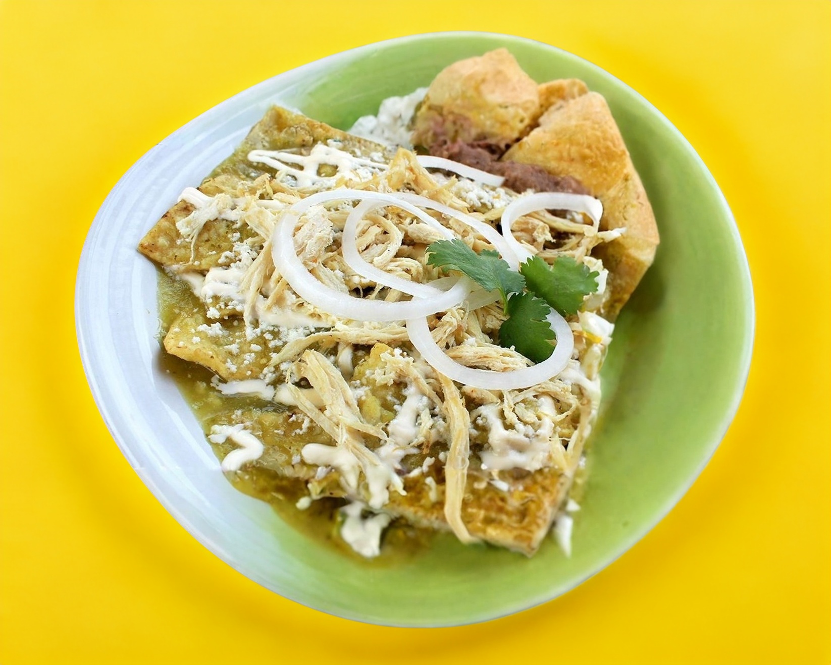 Chilaquiles verdes con pollo deshebrado.