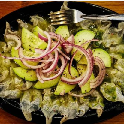 Camarón fresco curtido en limón con la salsa aguachile tradicional, con cebolla morada, pepino y aguacate. incluye tostadas y salsa.