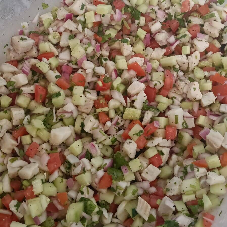 Filete de pescado picado en cuadrito curtido en limón, con cebolla, jitomate, pepino y cilantro.