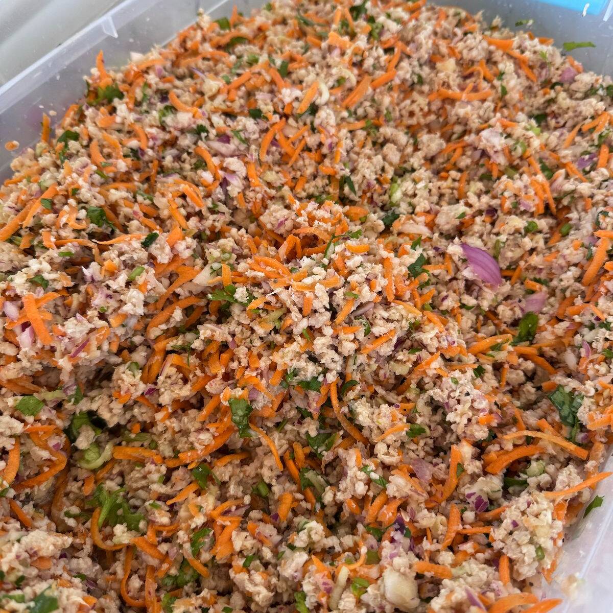Pescado molido curtido en limón, con cebolla, zanahoria y cilantro.
