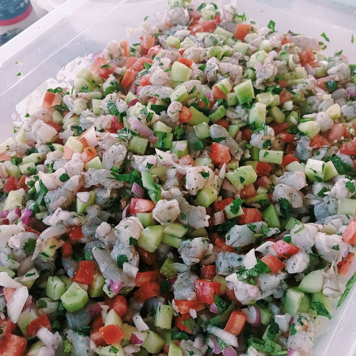 Camarón fresco curtido en limón, con cebolla, jitomate, pepino y cilantro.