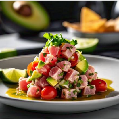 Atún fresco curtido en limón, con cebolla, pepino, jitomate y cilantro. Incluye tostadas y salsas