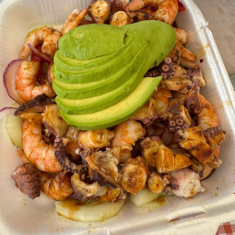 Ensalada de pulpo,camaron,jitomate y pepino en salsas negras de la casa