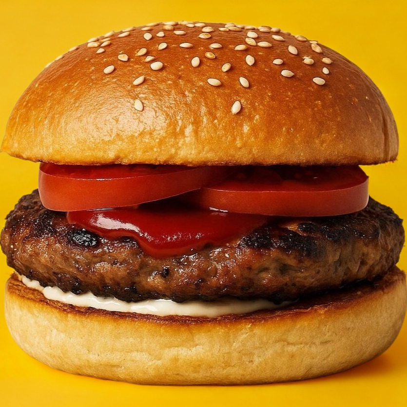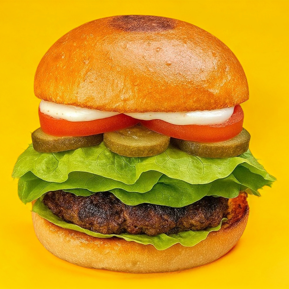Carne de res jugosa al fuego, pan suave y dorado, jitomate fresco, pepinillos, lechuga crujiente y mayonesa. Una hamburguesa sencilla, abundante y con todo el sabor.