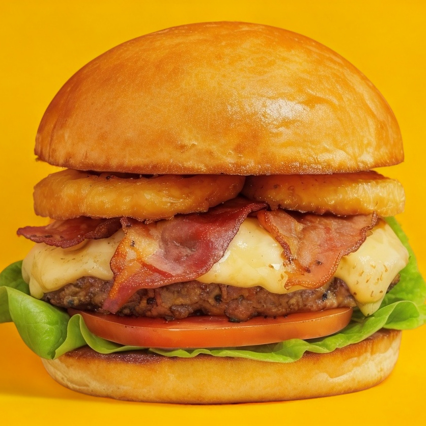 Tocino ahumado, queso cheddar fundido y carne jugosa al fuego. Aros de cebolla crujientes bañados en salsa BBQ, con vegetales frescos y aderezos. Un golpe dulce y ahumado que llena sin medida.