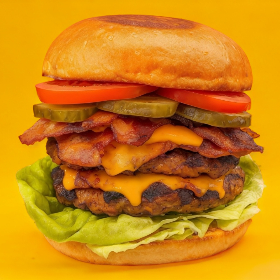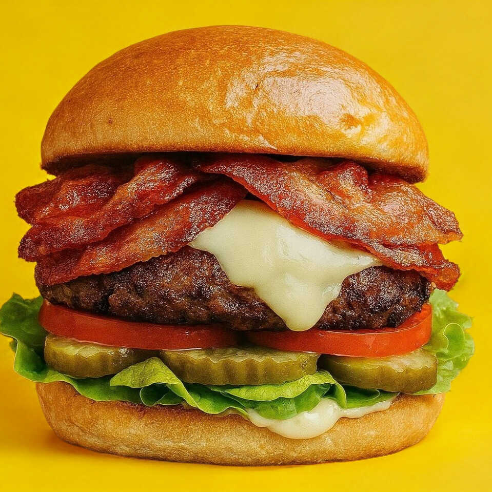 Tocino ahumado que marca el sabor, queso cheddar fundido y carne jugosa al fuego. Vegetales abundantes con mayonesa, mostaza, catsup y crema. Pesada, cargada y hecha para saciar en serio