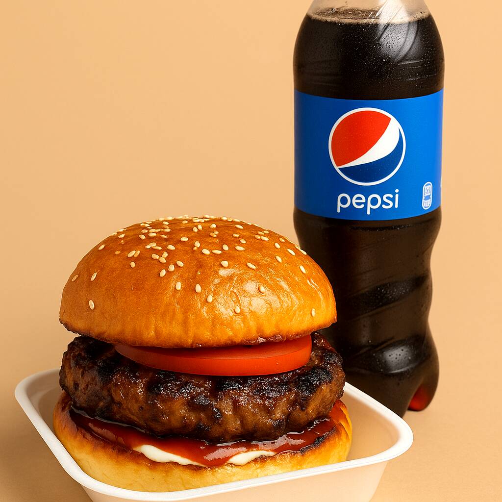 Bueno, completo y al precio justo: hamburguesa del día con carne a la plancha, pan dorado, jitomate fresco, catsup y crema. Se acompaña con una Pepsi fría. La opción básica que resuelve rápido y sin gastar de más.