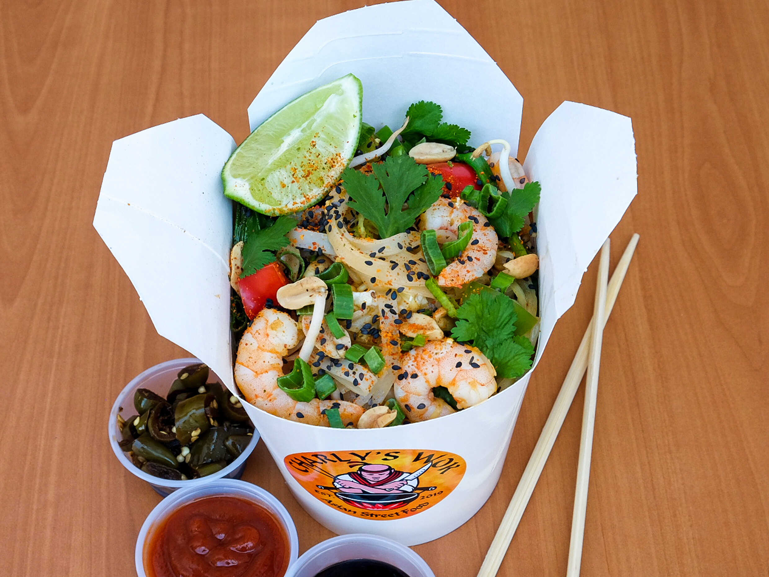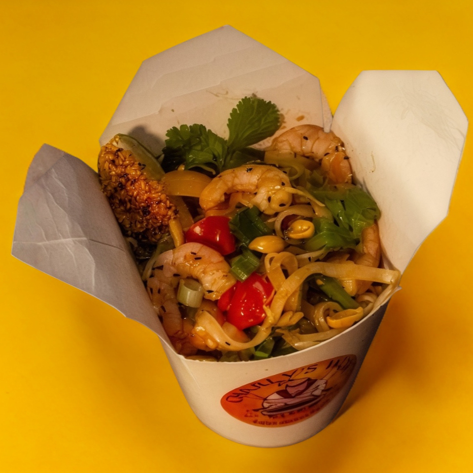 Noodles de Arroz camarón, pimientos,soya, cebolla c, cebollín salsa tailandesa cacahuate sésamo limón cilantro