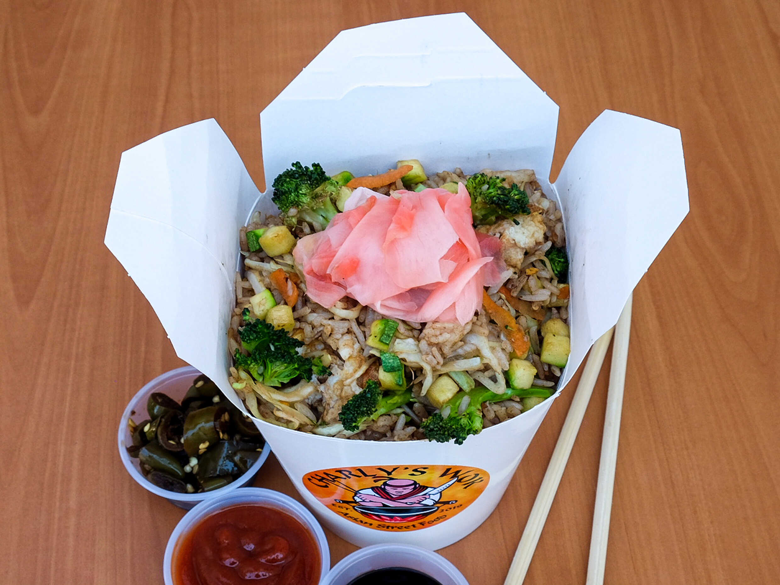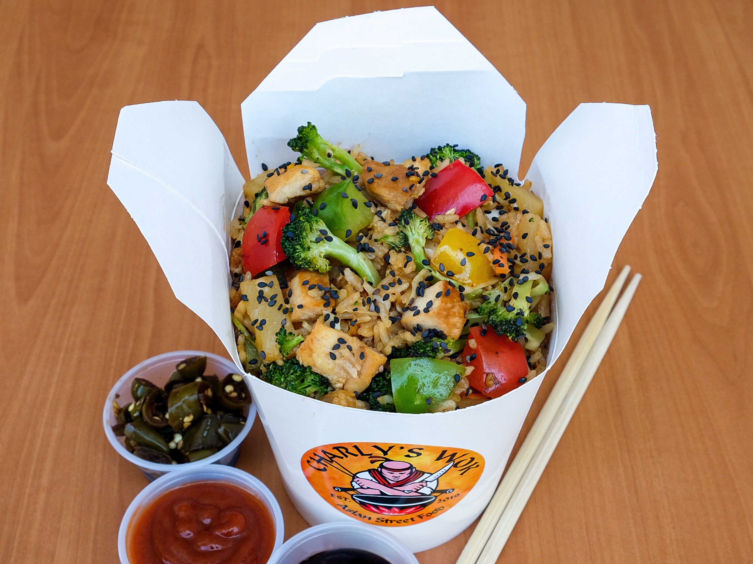 Para una persona 500Gr aprox, Base de Arroz Jazmín con huevo y ajo, con pollo a la plancha, acompañado de: brócoli, pimientos y piña en salsa teriyaki con un toque de ajonjolí.