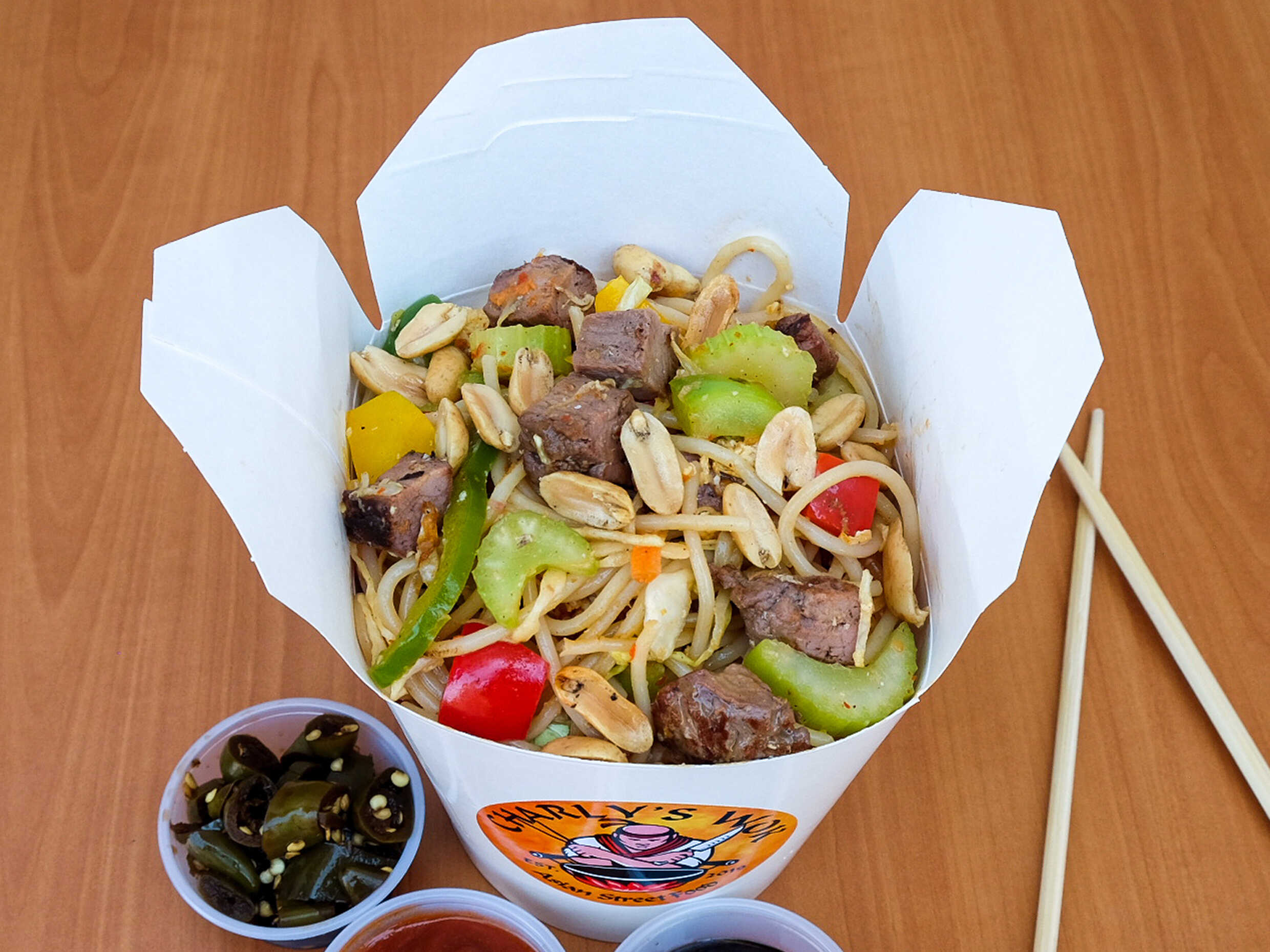 Base de noodles , arrachera marinada mix de pimientos y cacahuates en salsa thailandesa. Incluye , huevo , col y zanahoria rallada
