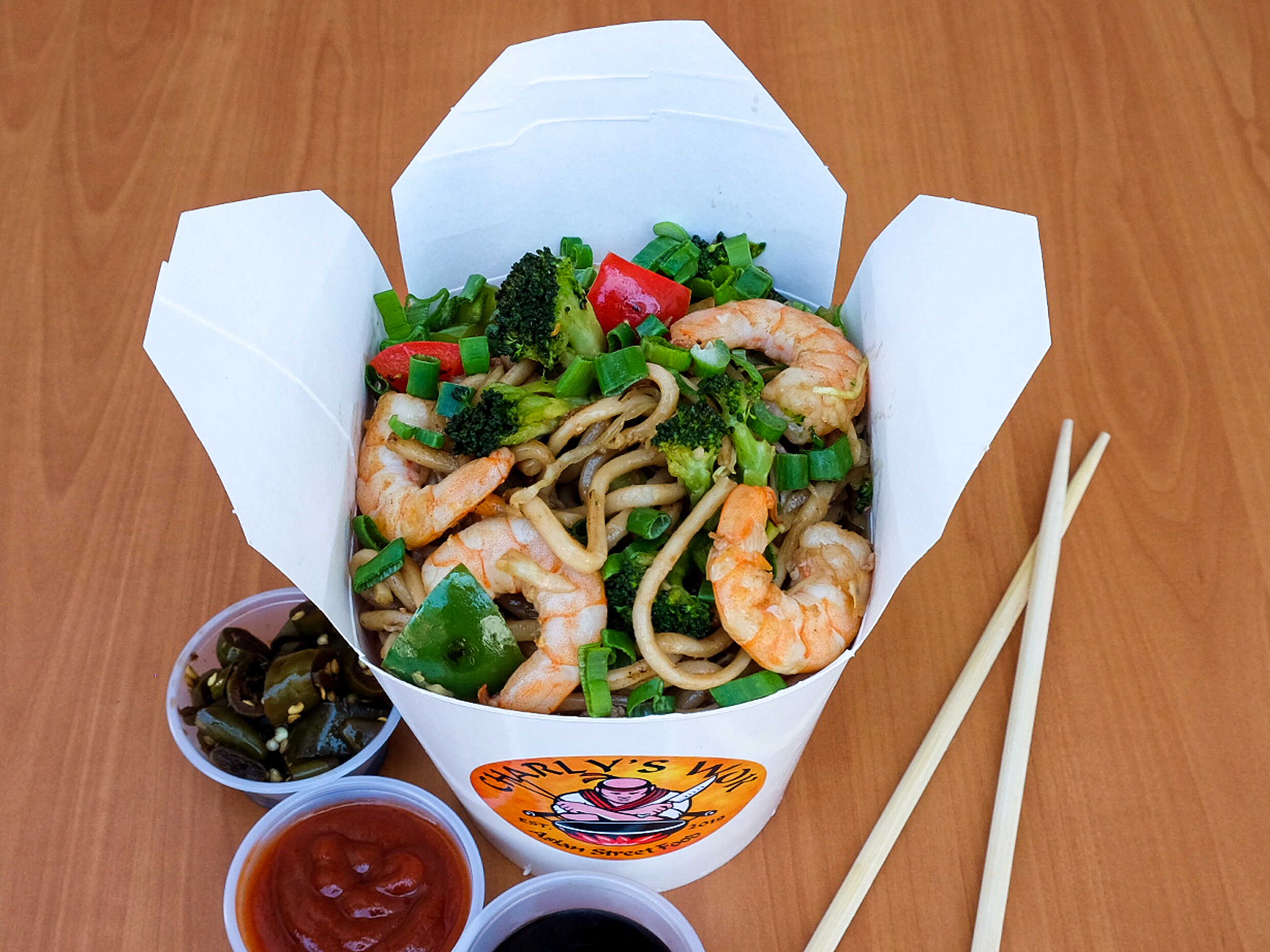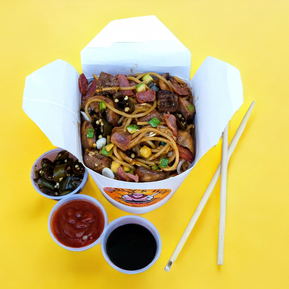 Base de Noodles con huevo y ajo, con arrachera, tocino, cebolla cambray, champiñones y calabaza en salsa teriyaki con un toque de picante y chiles toreados.