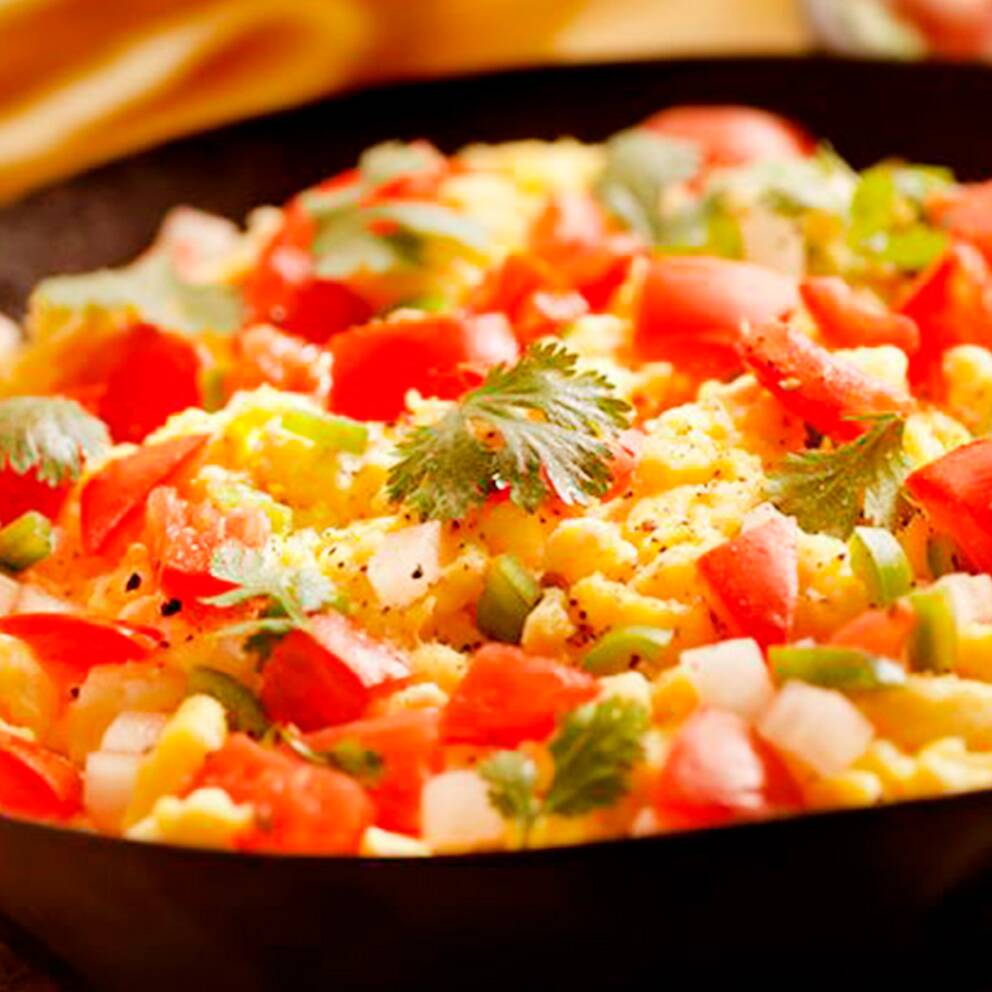 Huevos revueltos con cebolla, jitomate y chiles serranos