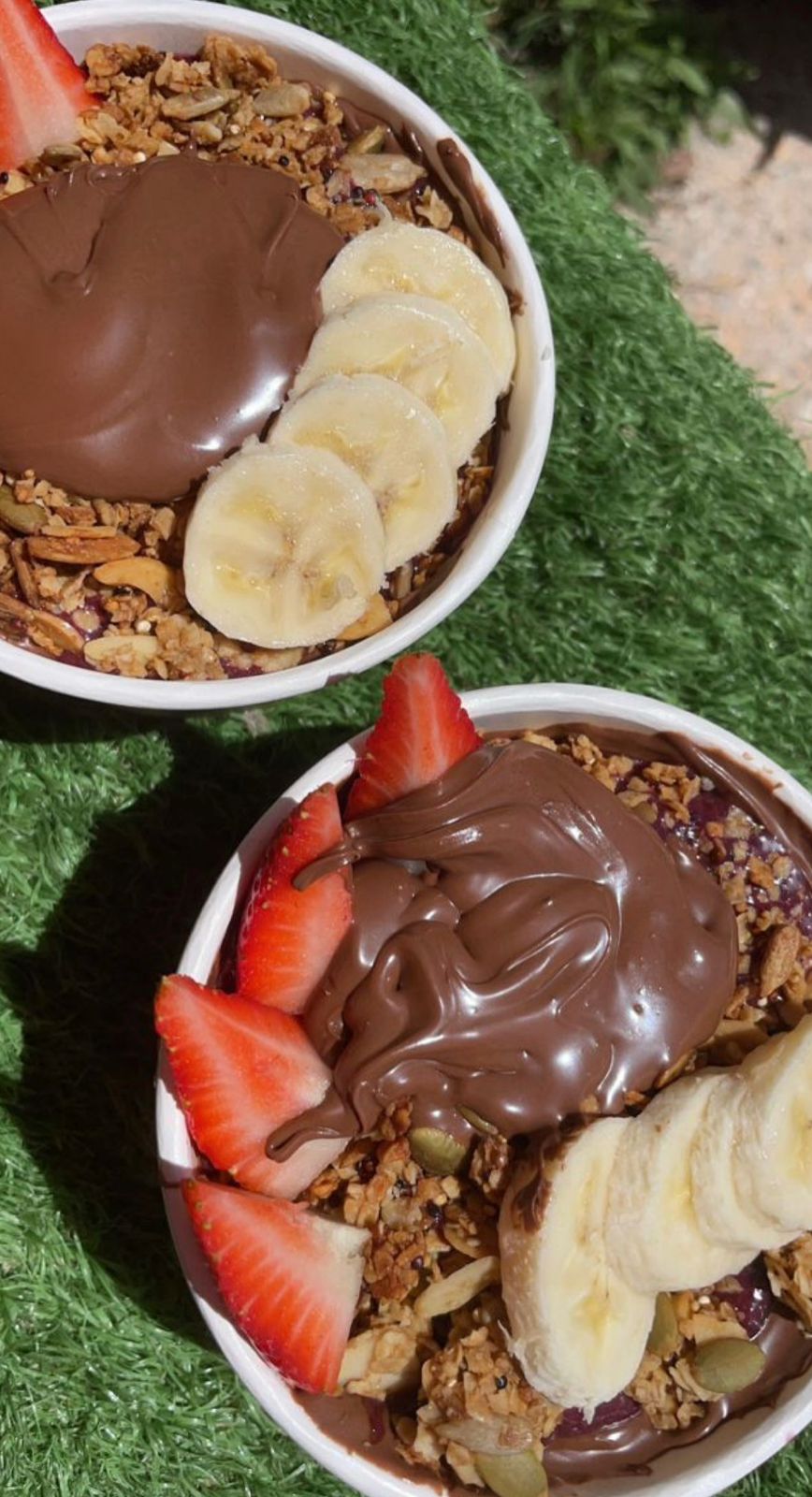 Smoothie bowl de plátano con granola tostada ,Nutella, fresas y plátano
