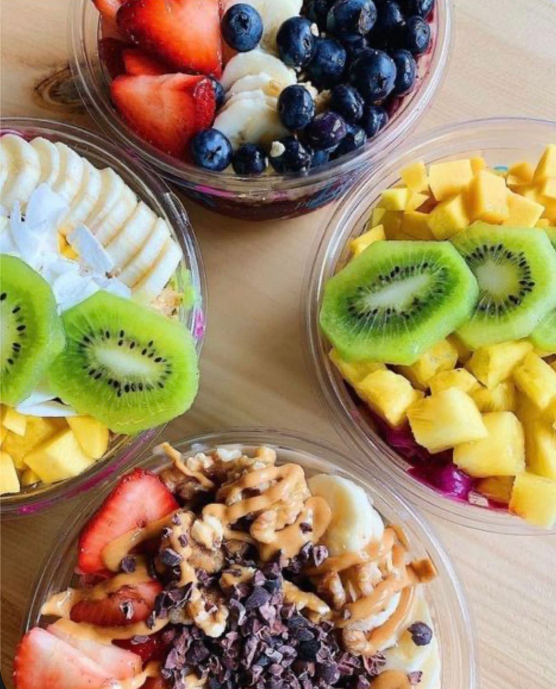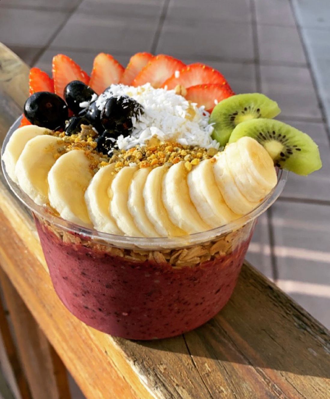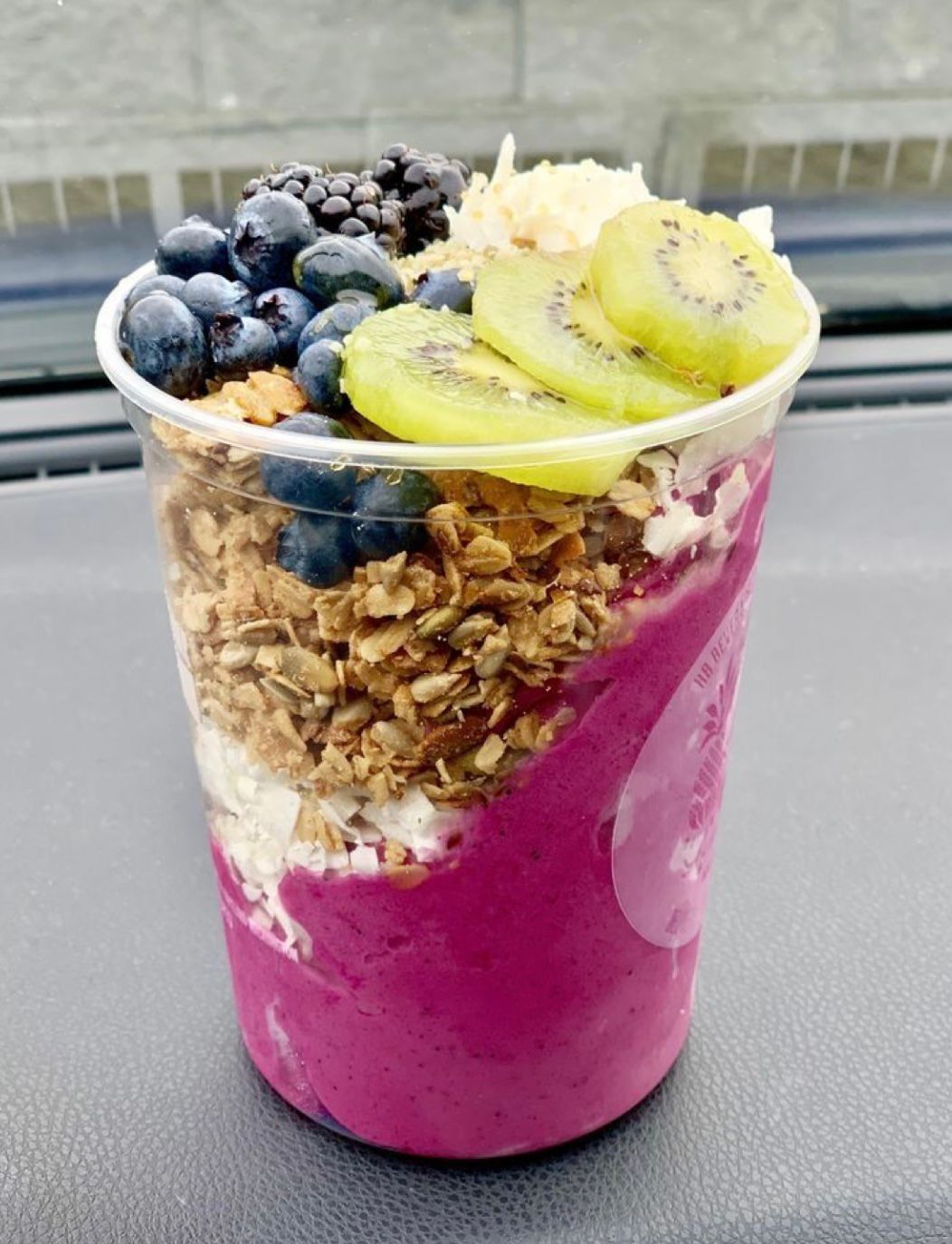 Smoothie de frutos rojos (mora, zarzamora,fresa, frambuesa) acompañado de granola, miel y fruta de temporada