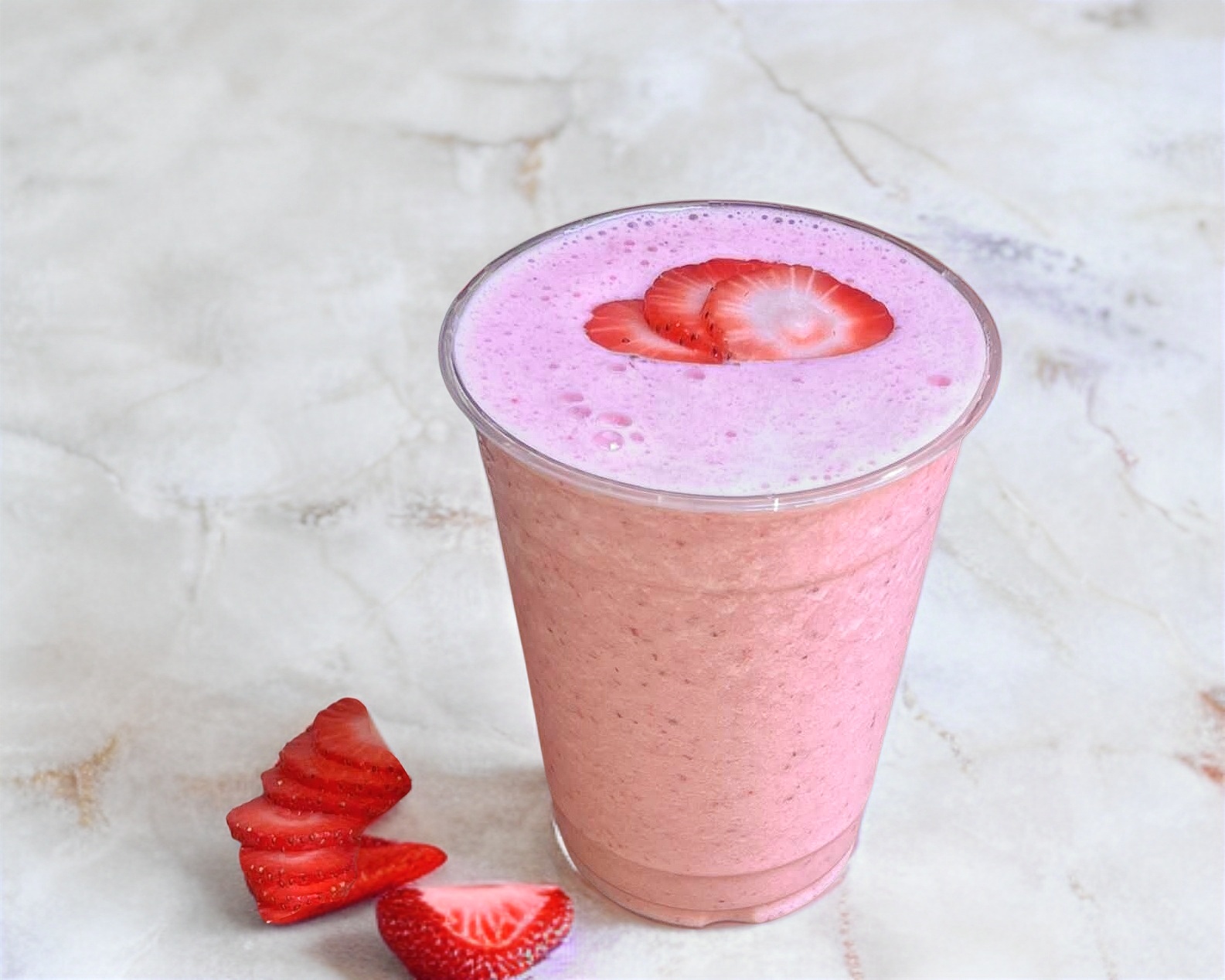 Licuado de fresa natural con hielos y leche en vaso de 16oz.