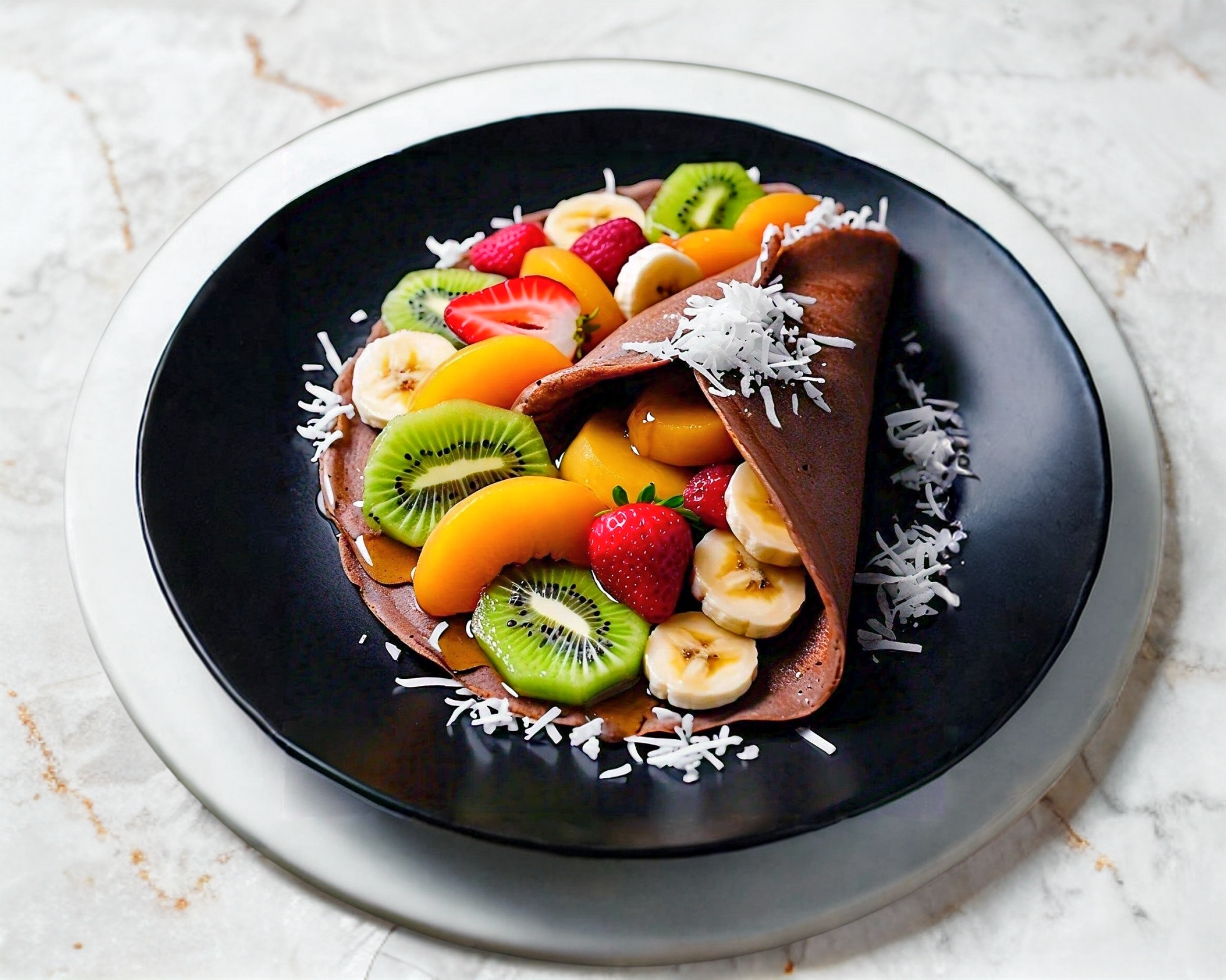 Nutritiva crepa rellena de kiwi, platano, fresa y durazno, con una porcion extra de frutas como guarnición, puedes agregarle sabor con tus ingredientes favoritos.