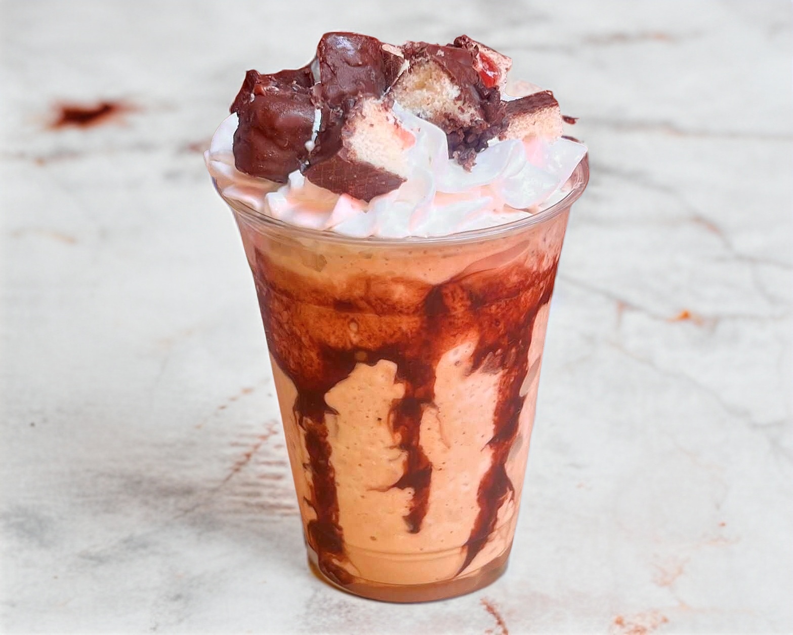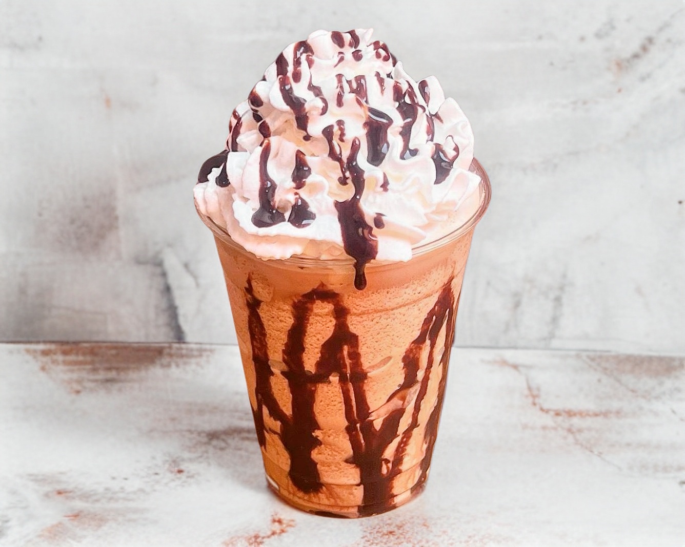 Base de frappé, con hielo, chocolate hersheys y leche, en vaso de 16oz.