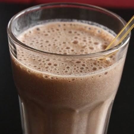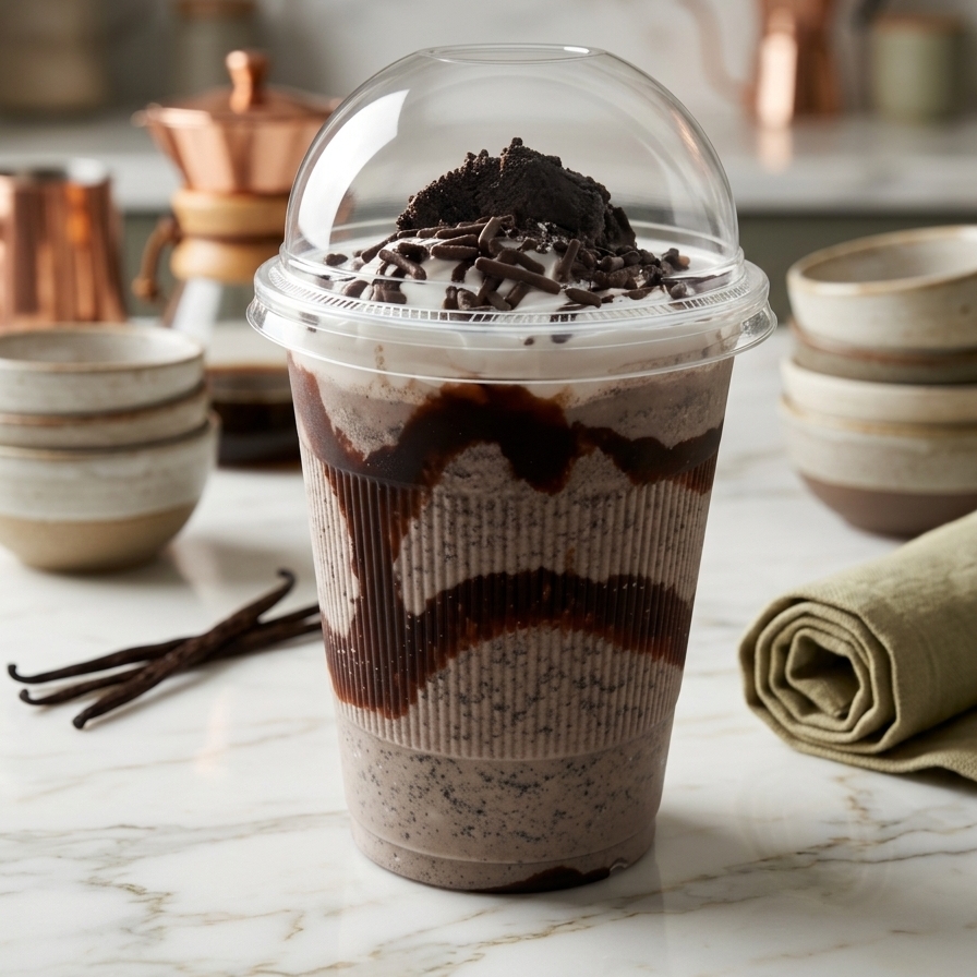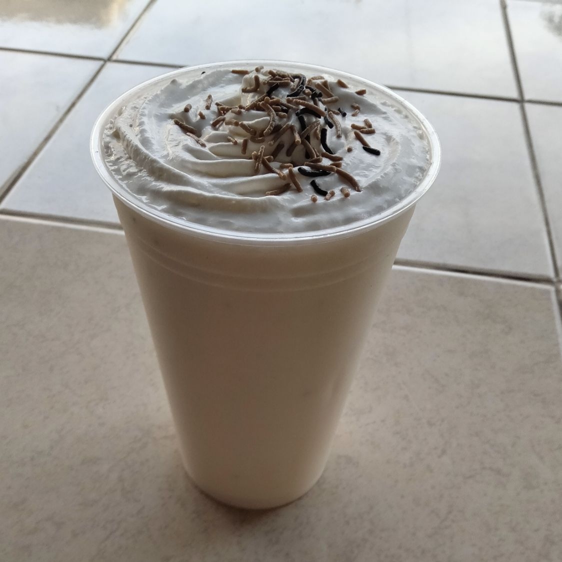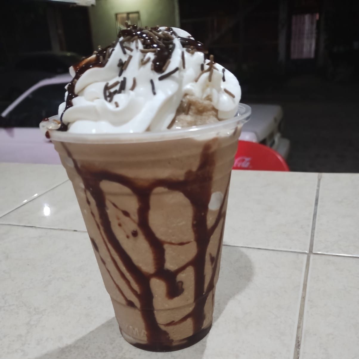 A base de leche, cocoa, café, crema en polvo, azúcar y hielos decorado con crema chantilly chocolate Hershey's y chispas de chocolate.
