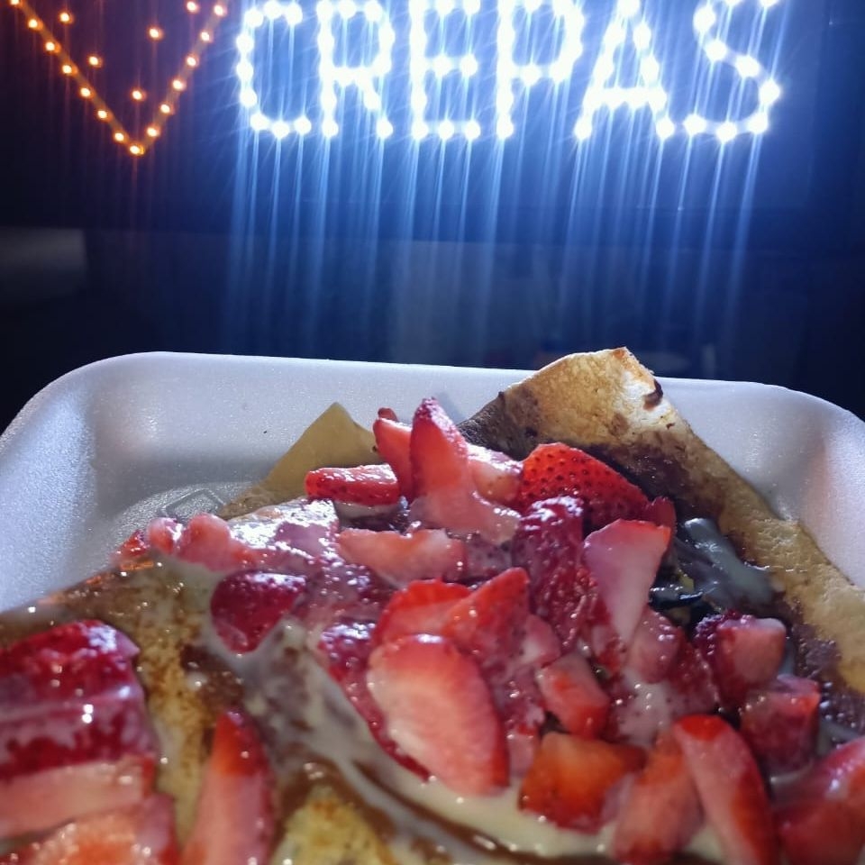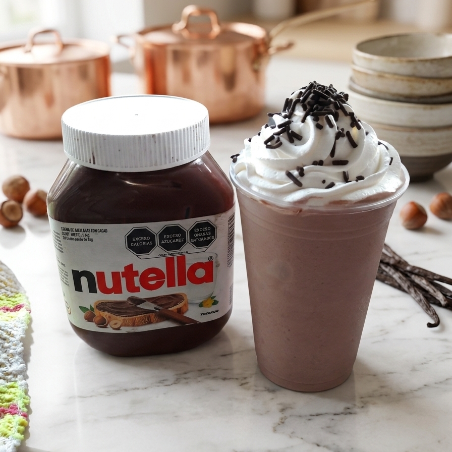 A base de leche, Nutella, un poco de café, crema en polvo, hielos decorado con Hershey's crema chantilly y chispas de chocolate.