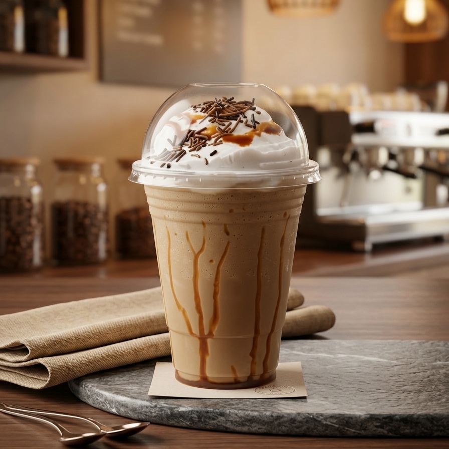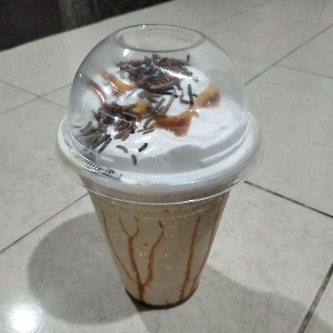 Preparado a base de leche, café, crema en polvo, azúcar y hielos, decorado con crema chantilly, chocolate Hershey's y chispas.