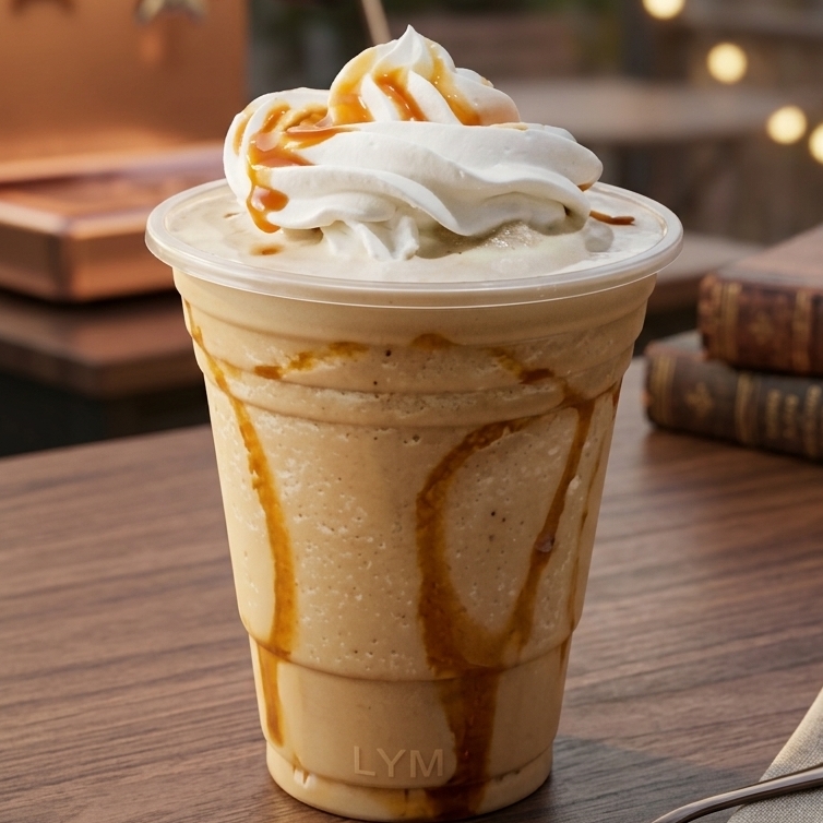 A base de leche, caramelo, un poco de café crema en polvo, azúcar y hielos decorado con crema chantilly caramelo.