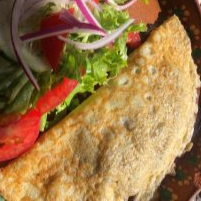 Deliciosa tortilla esponjosa de huevo, rellena de jamon y queso, guarnición de ensalada fresca de la casa