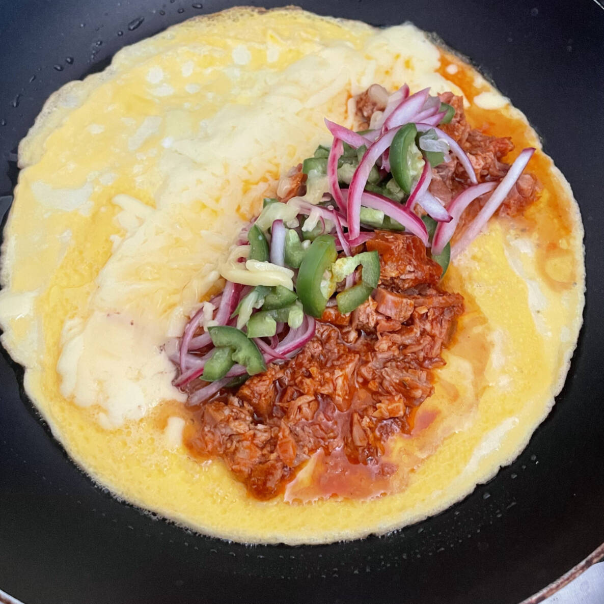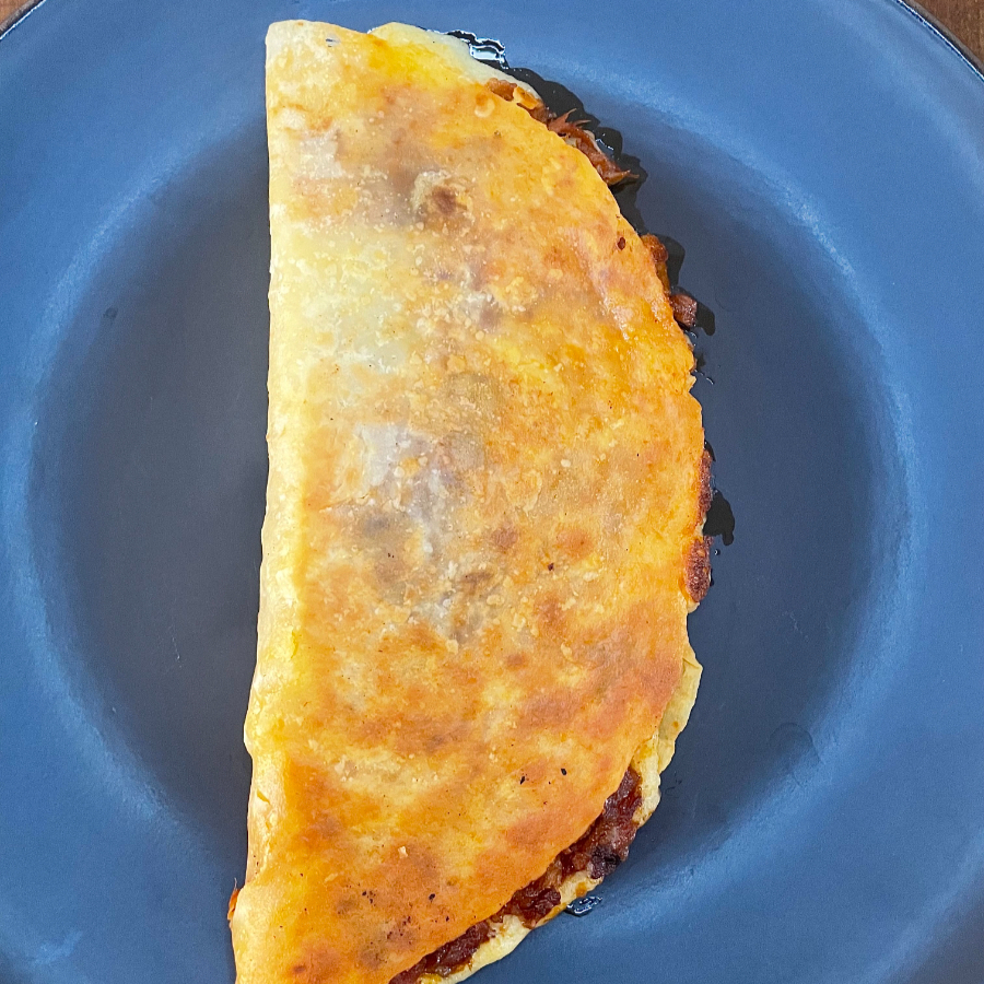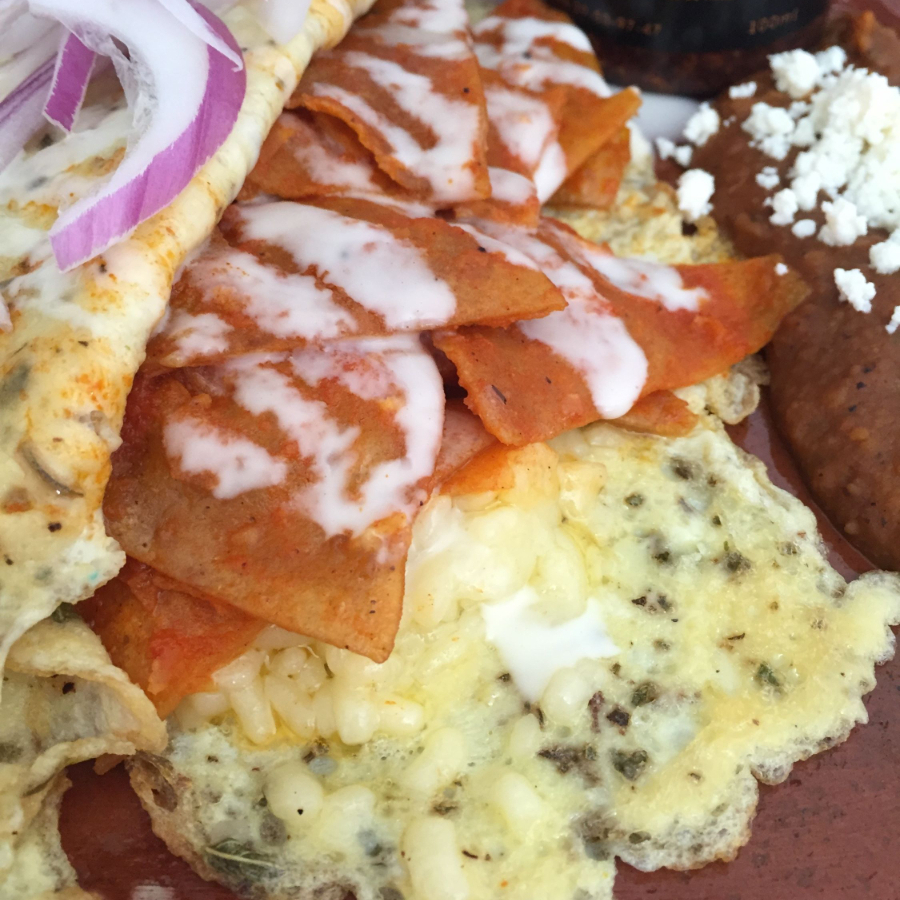 Tortilla esponjosa de huevo, con la que envolvemos una deliciosa porción de chilaquiles rojos gratinados.