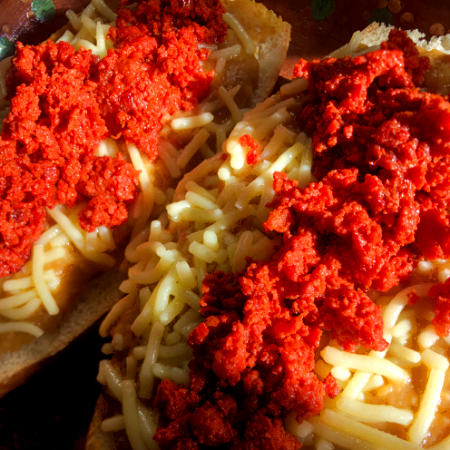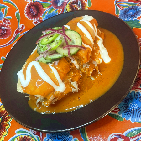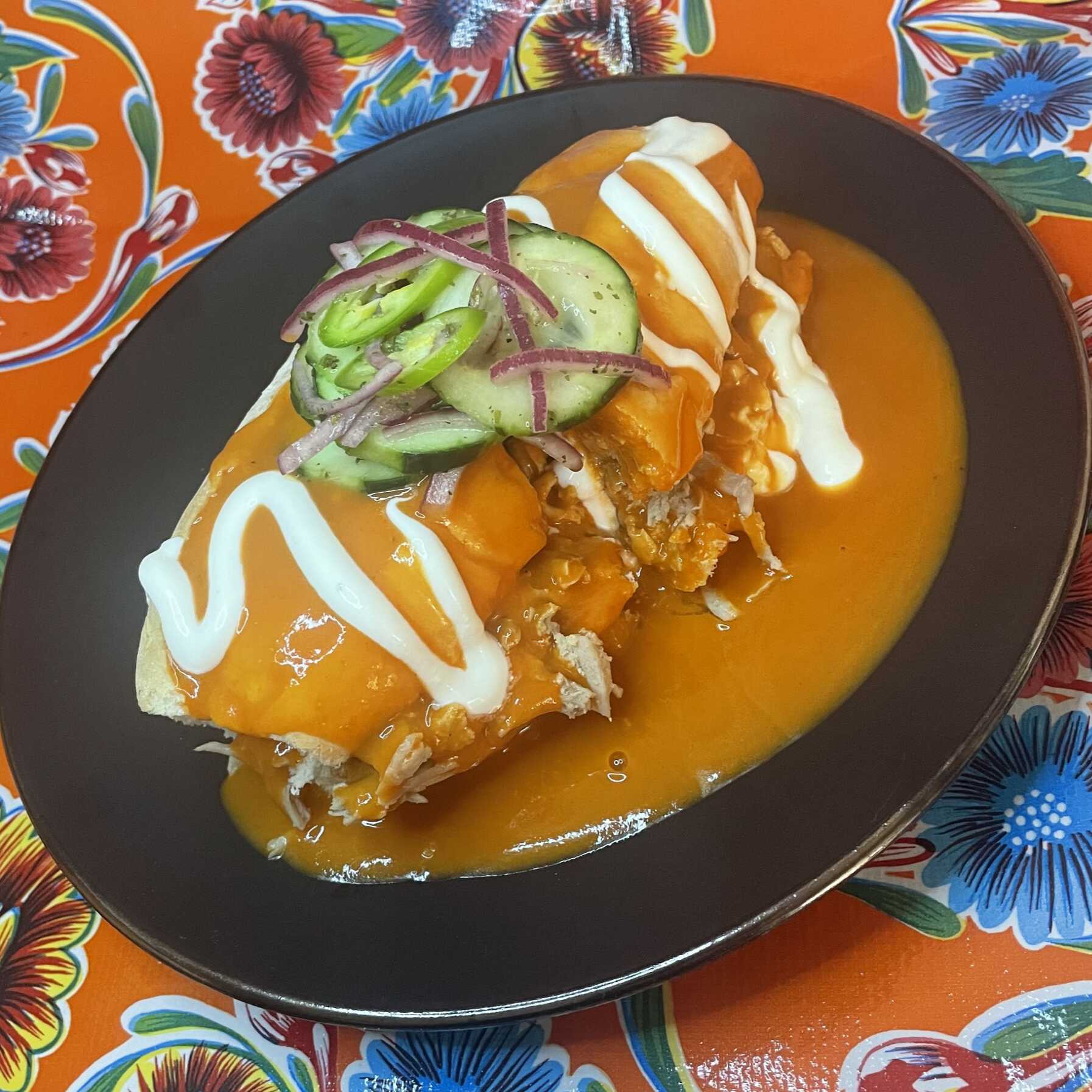Delicioso bolillo doradito con chilaquiles rojos, crema y queso. Elige el nivel de picor!!!