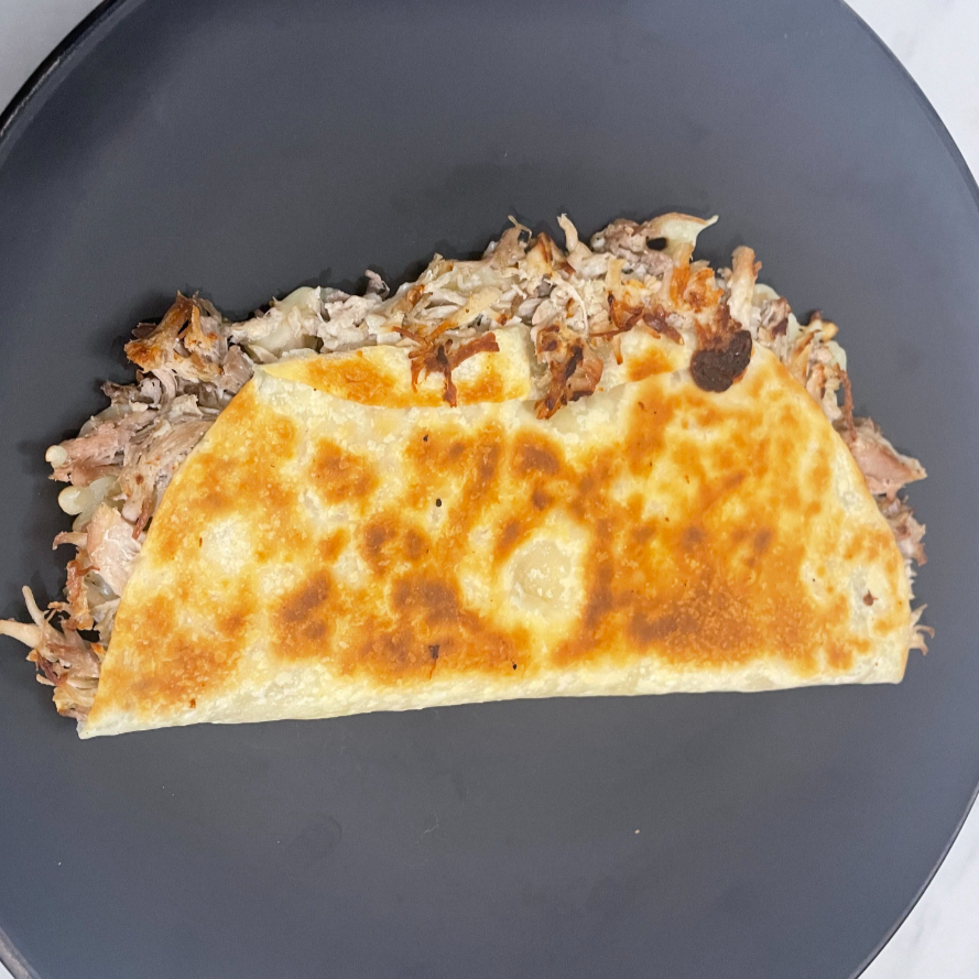 Deliciosa tortilla de harina doradita con queso gouda y chicharrón