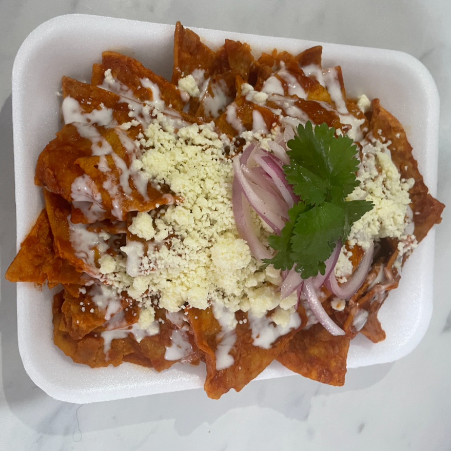 Deliciosos chilaquiles rojos, con crema y queso fresco. Coronados con cebolla morada curtida y hojas de cilantro