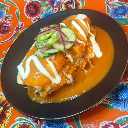 Delicioso y crujiente lonche de pierna, bañado con la salsa especial de la casa, crema ácida y acompañado con guarnición de pepino, cebolla y chile serrano. Todos nuestros platillos incluyen picante CUAC