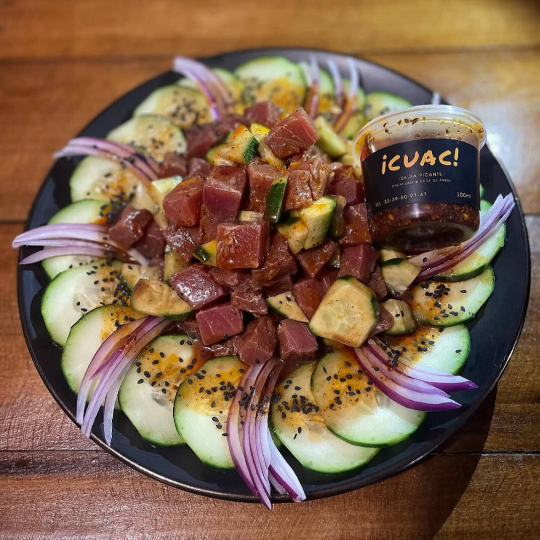 Exquisitos cubos de atún en salsas negras, acento de chile serrano y cebolla morada. Fresco y delicioso!!!