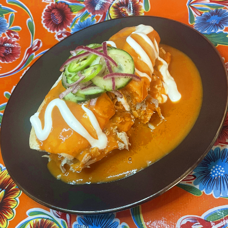 Chicarrón en salsa, gratinado con queso, envuelto en una esponjosa tortilla de huevo, con acento de chile serrano y cebolla morada. Guarnición de ensalada fresca de la casa