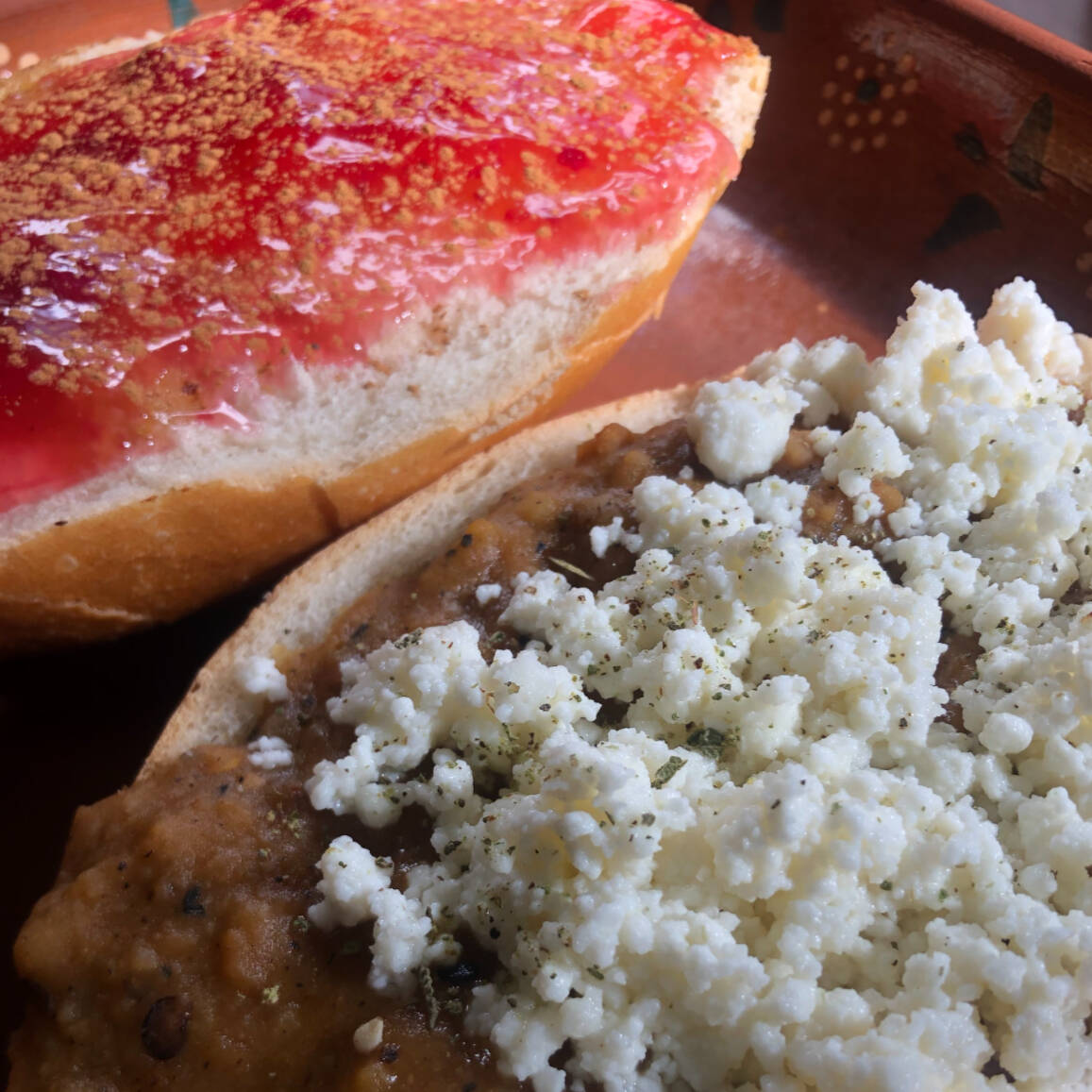 Un par de molletes con bolillo dorado con mantequilla, uno de frijoles refritos con queso, y otro a elegir con cajeta, mantequilla, azúcar y canela o mermelada de fresa.