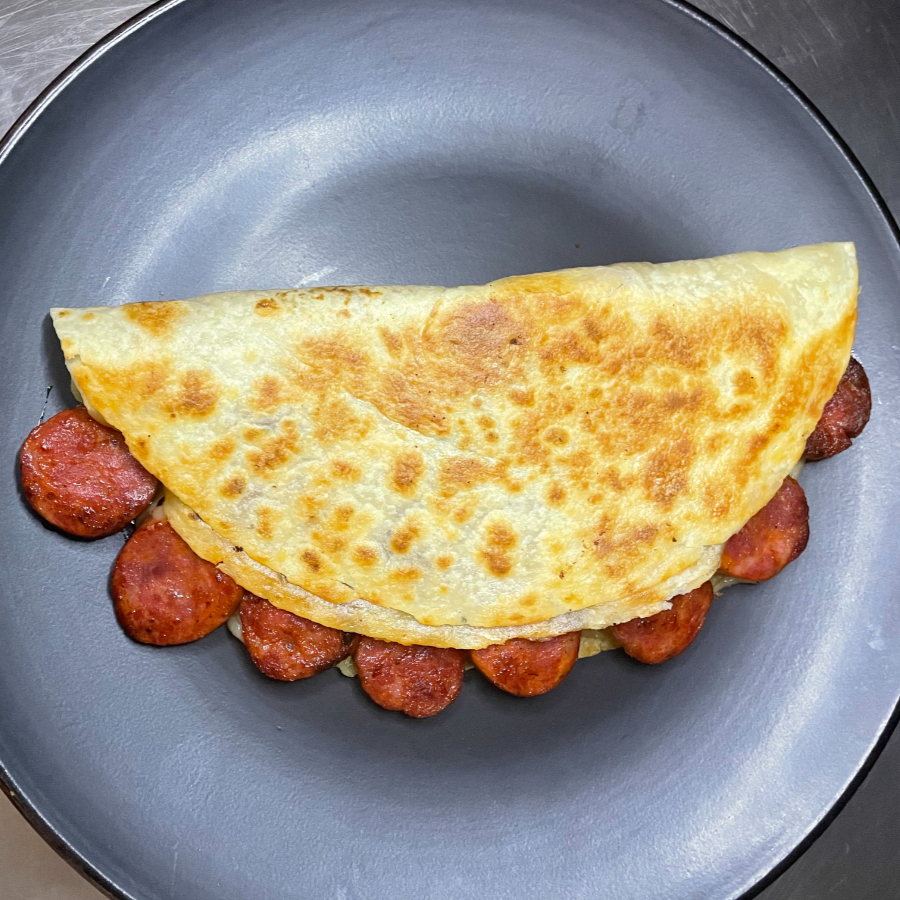 Deliciosa tortilla de harina con queso gouda y chorizo para asar