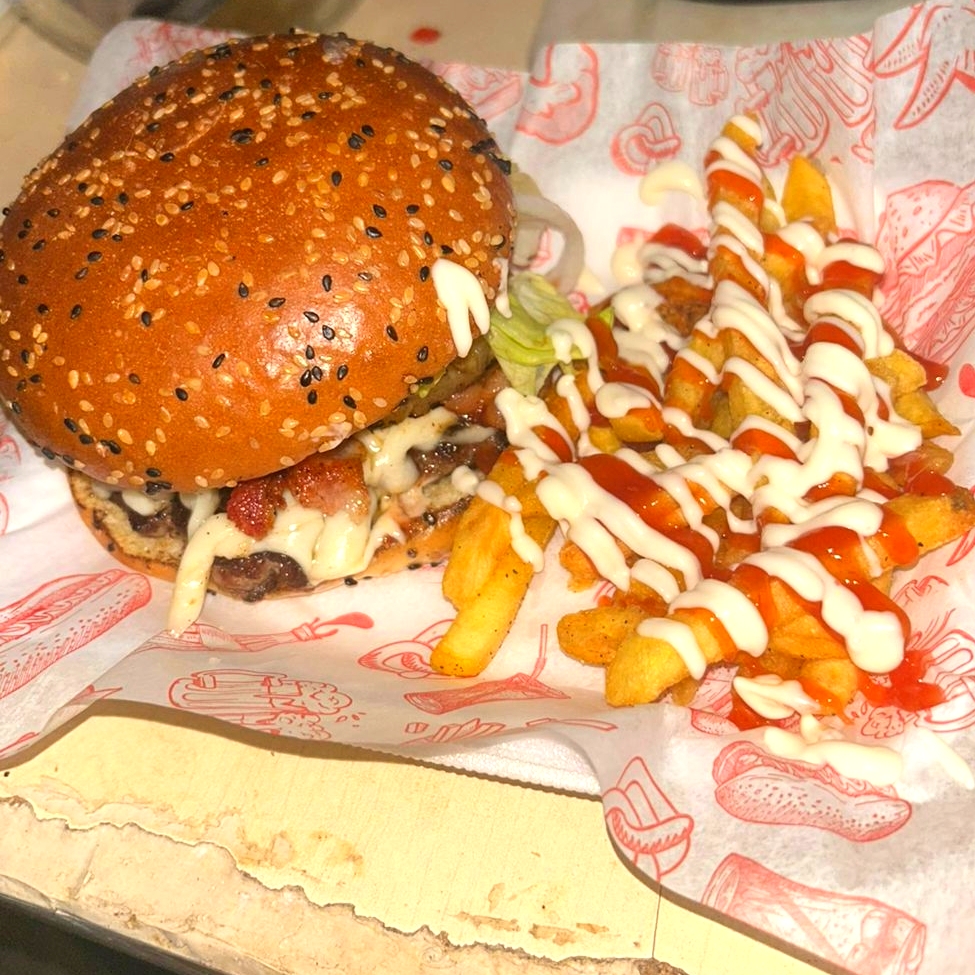 Carne de res doble, queso amarillo americano, salsa Bbq, adereseo de pepinillos, tocino, aros de cebolla.