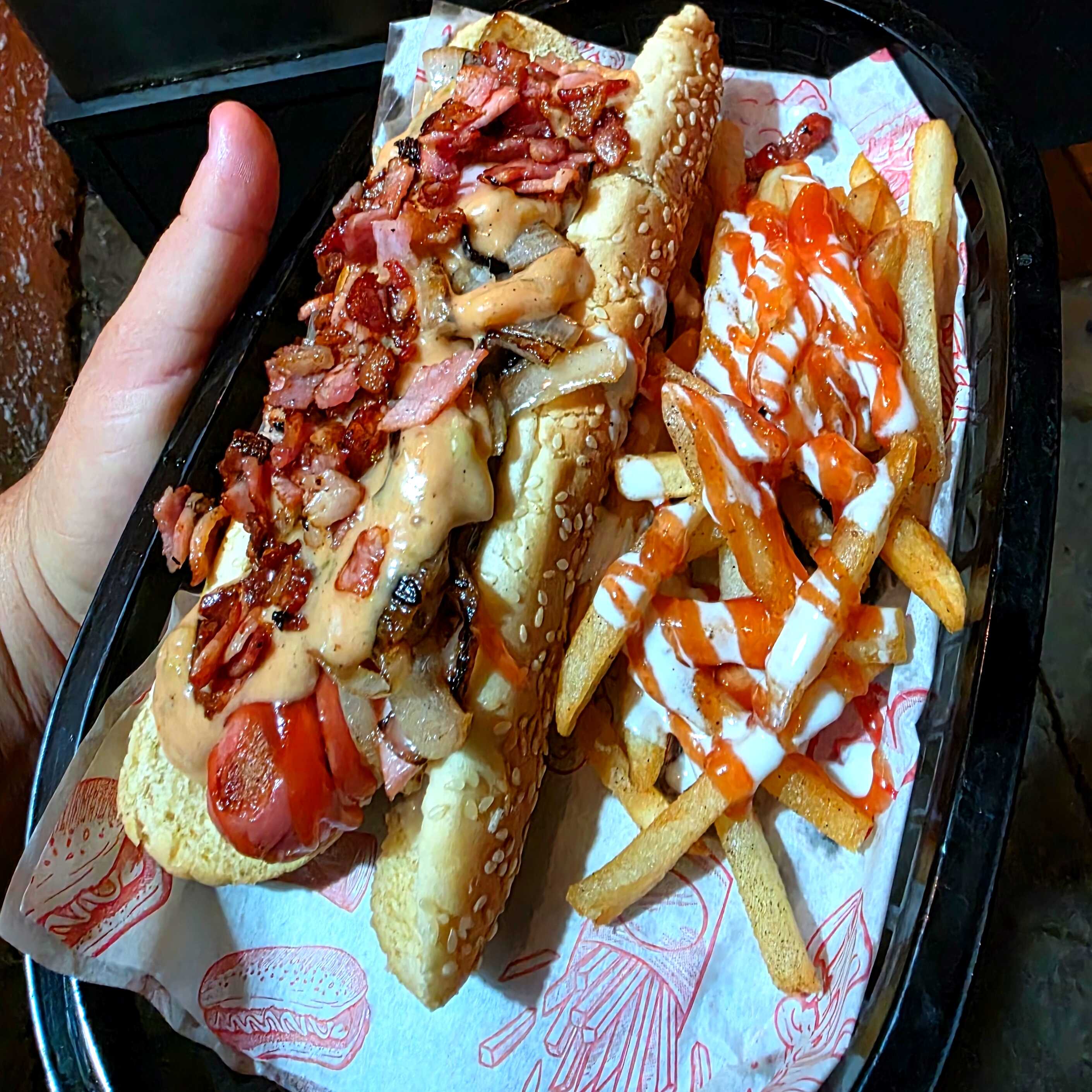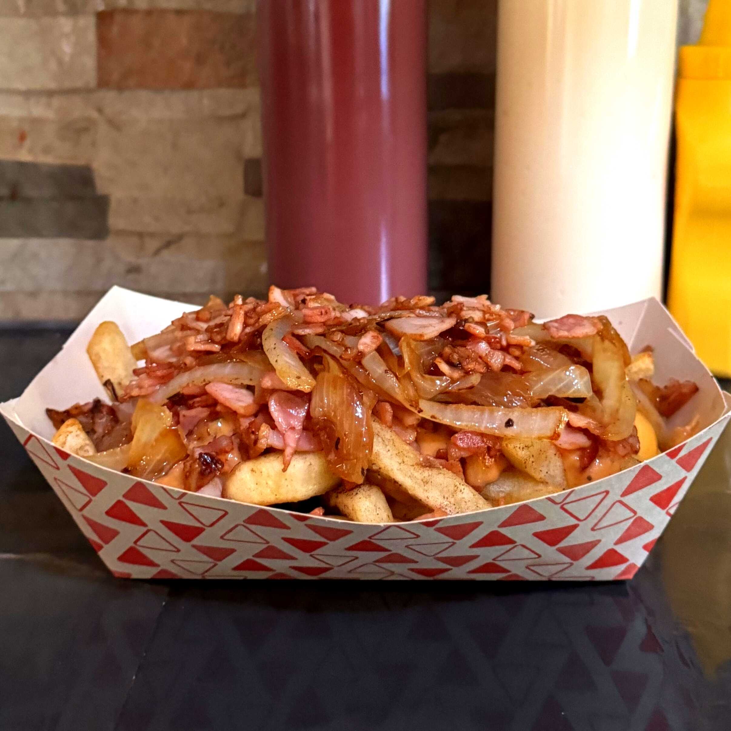Papas fritas cubiertas de queso amarillo americano, cebolla caramelizada aderezo de pepinillos y tocino