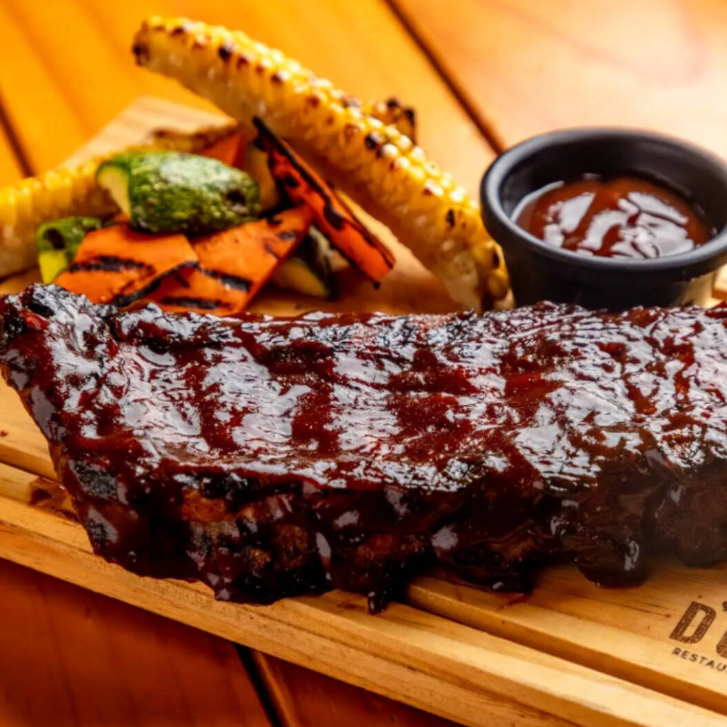 400 gramos de costilla de cerdo bañada en salsa BBQ acompañada con vegetales asados.