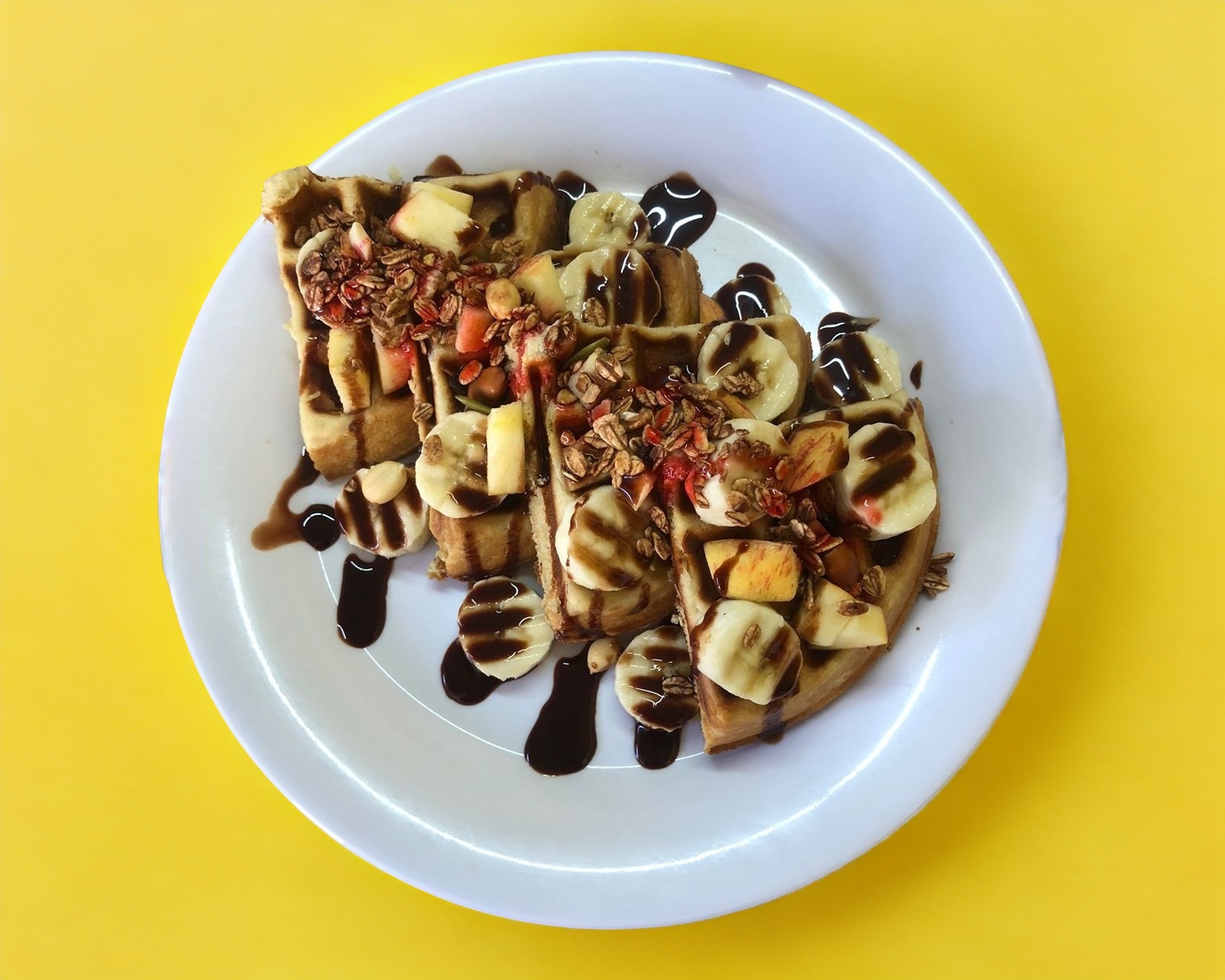 Wafle sabor vainilla, fresa, manzana granola y chocolate líquido