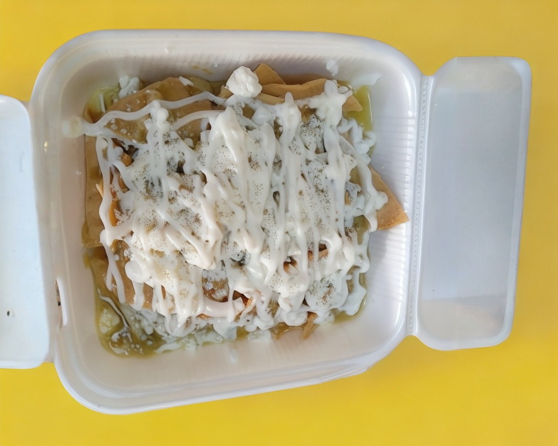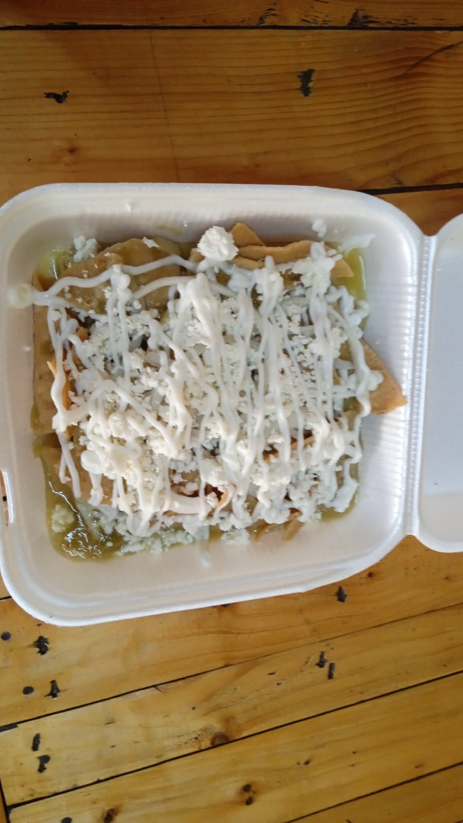 Chilaquiles grandes que incluyen: queso fresco, crema y cebolla.
